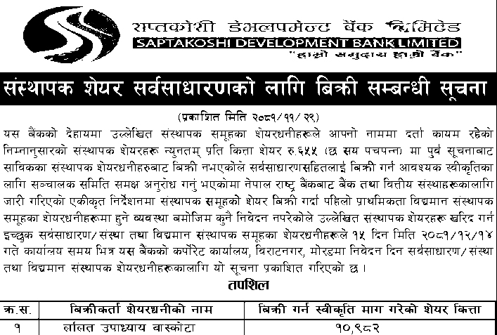 काठमाडौं । सप्तकोशी डेभलपमेन्ट बैंकले १० हजार ९ सय ८२ कित्ता संस्थापक सेयर बिक्रीमा राखेको छ। बैंकले यी सेयर सबैले किन्न पाउने गरी बिक्रीमा राखेको हो।