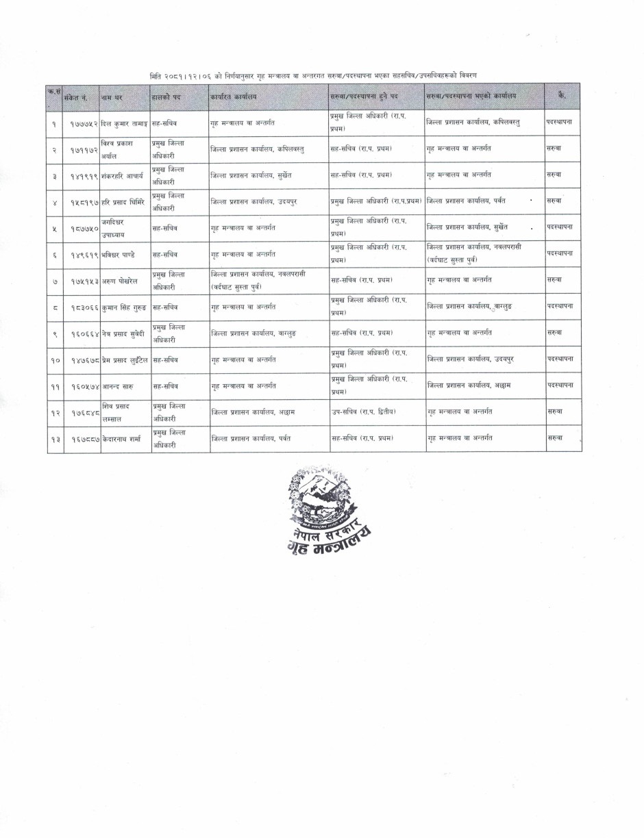 त्यस्तै, उदयपुरका प्रमुख जिल्ला अधिकारी हरिप्रसाद घिमिरेको जिल्ला प्रशासन कार्यालय पर्वतमा सरुवा भएको छ। जगदिश्वर उपाध्यायको सुर्खेत जिल्ला प्रशासन कार्यालयमा पदस्थापन भएको छ। भविश्वर पाण्डे नवलपरासी (बर्दघाट सुस्ता पूर्व)का प्रमुख जिल्ला अधिकारी भएका छन्।