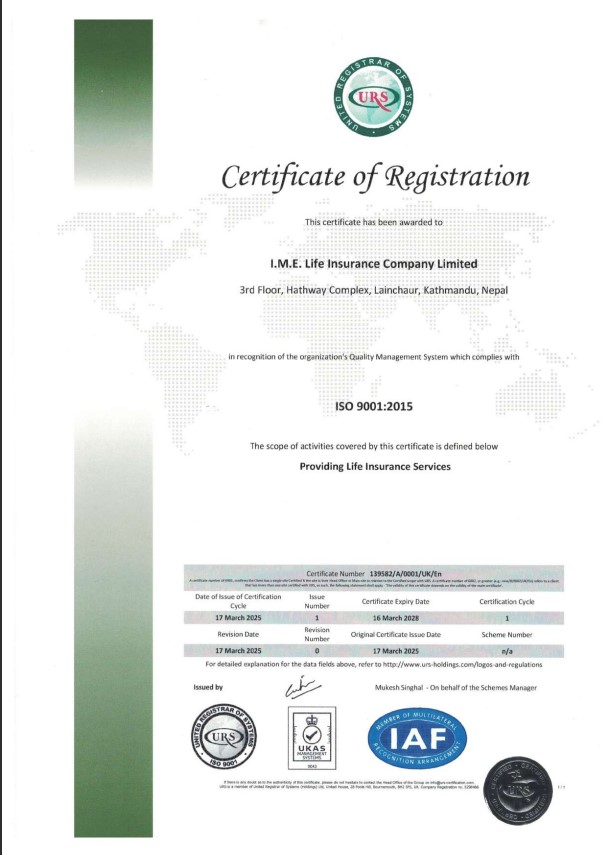 आईएमई लाइफले पायो आईएसओ ९००१ः२०१५ गुणस्तर प्रमाणपत्र