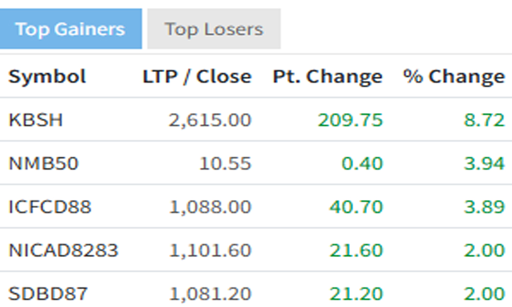 आज कुथेली बुखरीको सेयर मूल्य २०९ रुपैयाँ ७५ पैसाले बढेर २ हजार ६१५ रुपैयाँ पुगेको छ । यो अघिल्लो कारोबारभन्दा ८.७२ प्रतिशतले धेरै हो । त्यस्तै आज एनएमबी ५० को सेयर मूल्य ०.४० रुपैयाँले बढेर १० रुपैयाँ ५५ पैसा पुगेको छ । यो अघिल्लो कारोबारभन्दा ३.९४ प्रतिशतले धेरै हो ।
