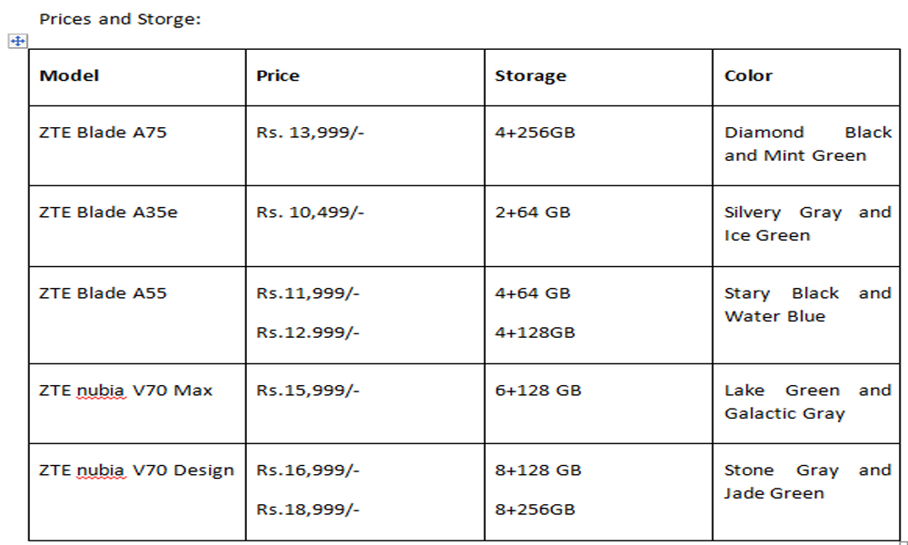त्यस्तै सामान्य प्रयोगको लागि जेडटीई ब्लेड ए३५ कम्प्याक्ट डिजाइन र ६.५२ इन्चको एचडि प्लस डिस्प्लेमा आएको छ । यसमा ८ एमपीको एआइ क्यामरा र ५,००० एमएएचको शक्तिशाली ब्याट्री रहेको छ । अक्टाकोर प्रोसेसर र ६ जिबिको ¥याम भएकोले यो दैनिक प्रयोजनको लागि अत्यन्तै उपयुक्त छ । अर्को मोडल जेडटीई ब्लेड ए ५५ मा ६.७५ इन्चको एचडि प्लस डिस्प्ले र १२८ जिबिको स्टोरेज र १३ एमपीको एआइ डुअल क्यामेरा रहेको छ । साथै फेस र फिंगर प्रिन्ट रिकग्निसनले थप सुरक्षा प्रदान गरेको छ भने लाइभ आइल्याण्ड फिचरले मल्टि टास्किंगलाई झनै सहज बनाएको छ ।