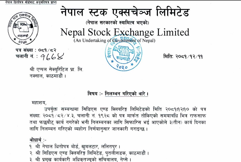 काठमाडौं । नेपाल स्टक एक्सचेन्ज (नेप्से) ले एप्पल सेक्युरिटिज प्रालिलाई ३ कार्यदिनका लागि निलम्बन गरेको छ। उक्त कम्पनीले तोकिएको समयसीभित्र राफसाफ तथा फछ्यौट प्रक्रिया पूरा नगरेकाले सीडीएस एन्ड क्लियरिङ लिमिटेडको सिफारिसमा उक्त निर्णय गरिएको नेप्सेले जनाएको छ।