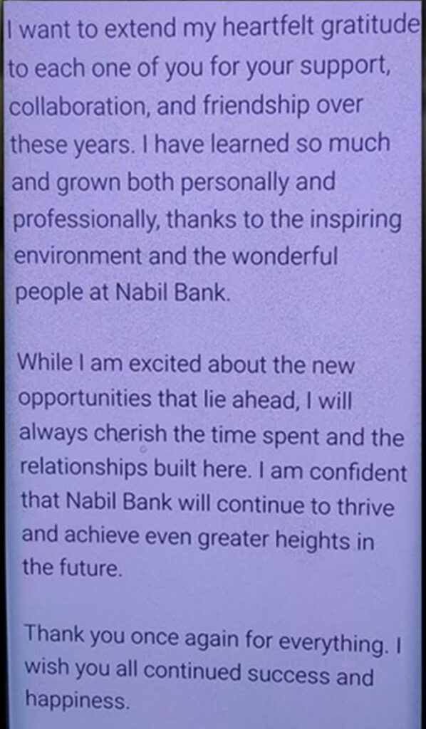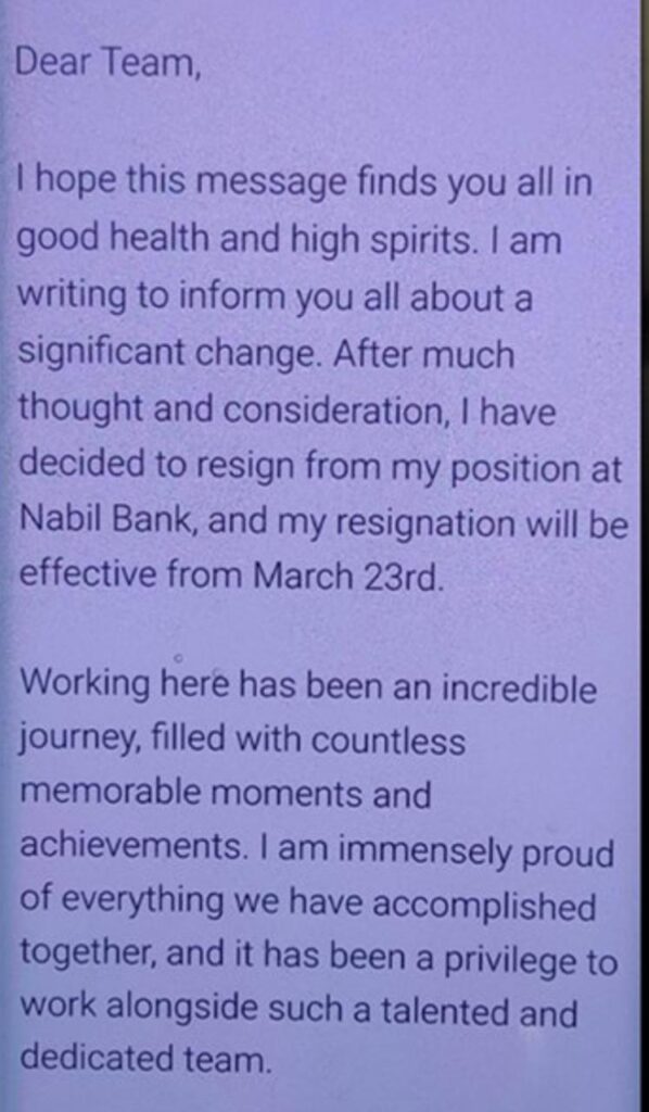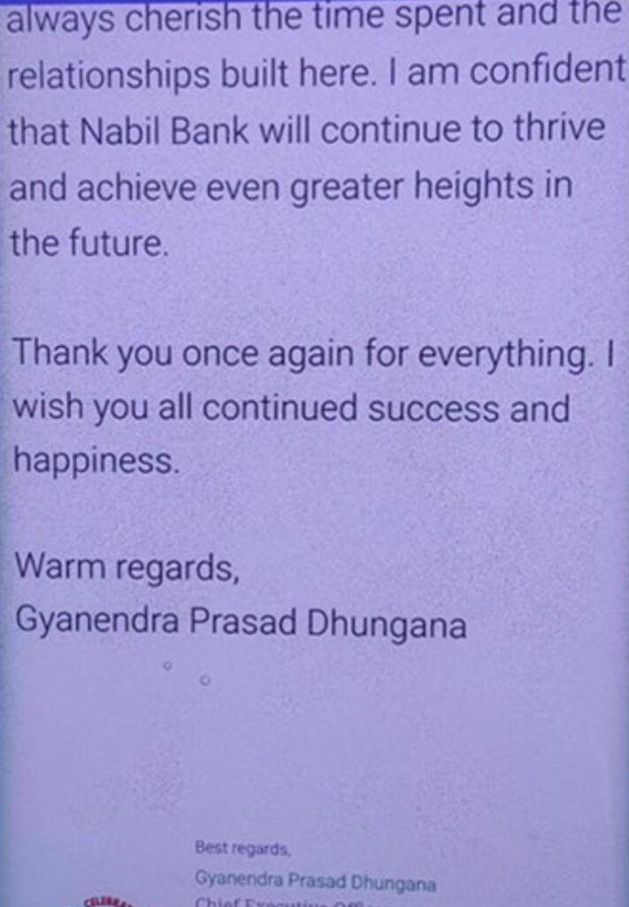 ढुंगानाले इमेल मार्फत पठाएको राजीनामा २३ मार्चदेखि लागू हुने गरेर राजीनामा दिएको र नयाँ अवसरको लागि जान लागेको उल्लेख गरेका छन् ।
