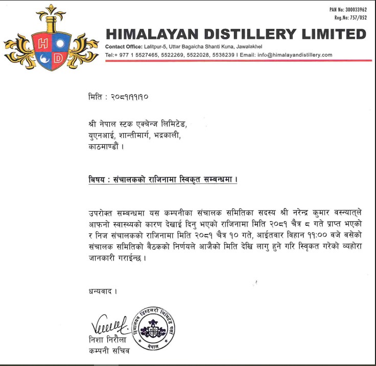काठमाडौं । हिमालयन डिस्टिलरी लिमिटेडका सञ्चालक नरेन्द्रकुमार बस्न्यातको राजीनामा स्वीकृत भएको छ ।