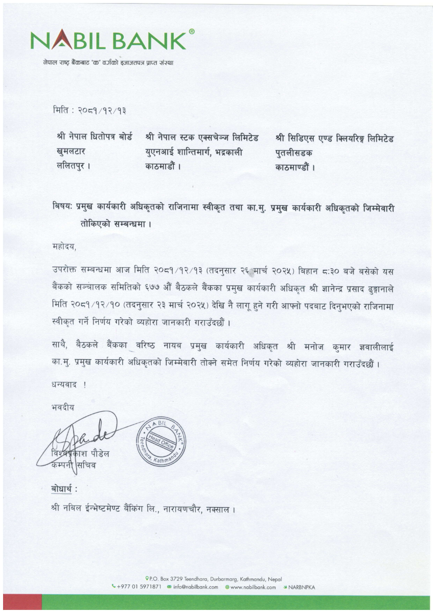 सीईओ ढुंगानाले चैत १० गतेदेखि लागू हुने गरी पदबाट राजीनामा दिएका थिए । बैंकले उक्त निर्णय स्वीकृत गर्दै बैंककै वरिष्ठ नायब प्रमुख कार्यकारी अधिकृतको रूपमा कार्यरत मनोजकुमार ज्ञवालीलाई कामु सीईओको रूपमा जिम्मेवारी तोकेको कम्पनी सचिव विश्वप्रकाश पौडेलले जानकारी दिएका छन् ।