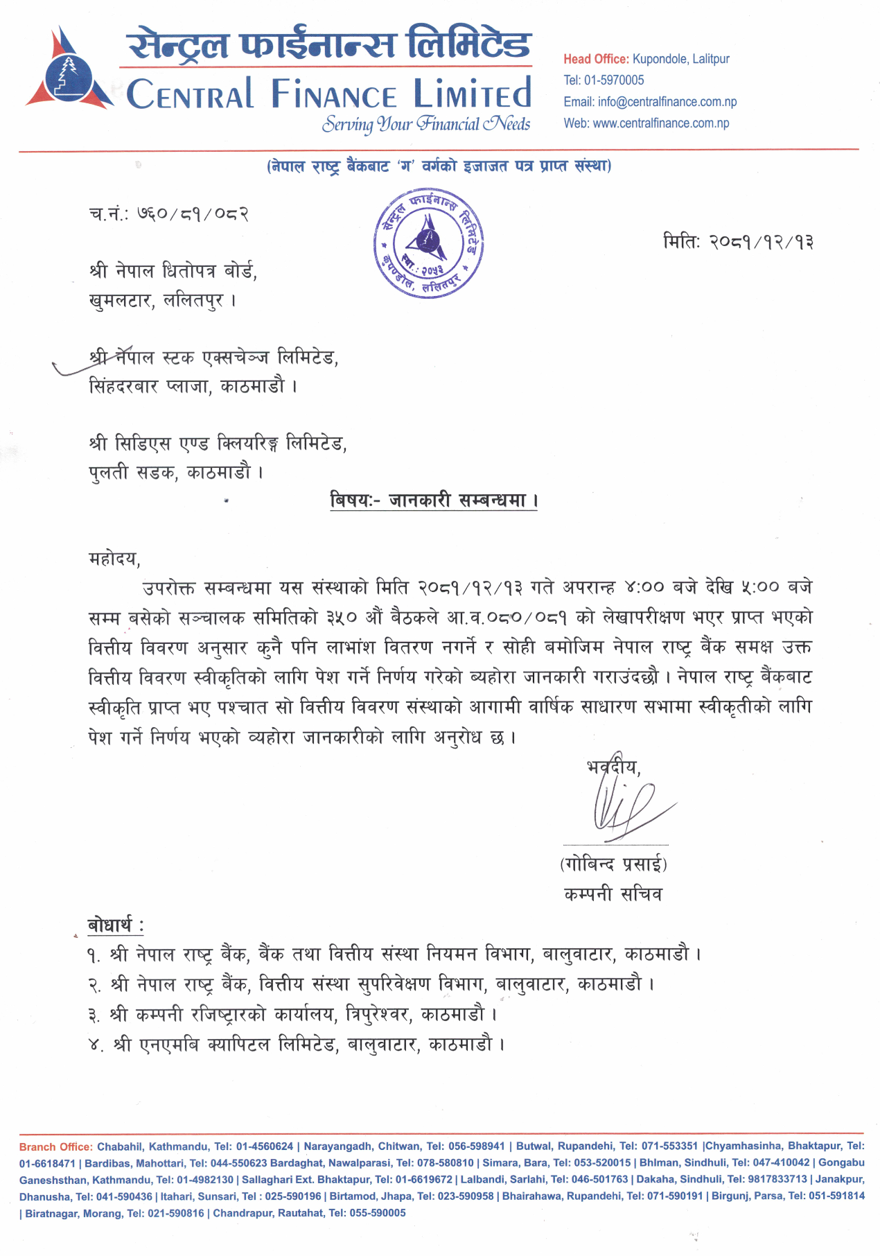 सेन्ट्रल फाइनान्सले लाभांश वितरण नगर्ने