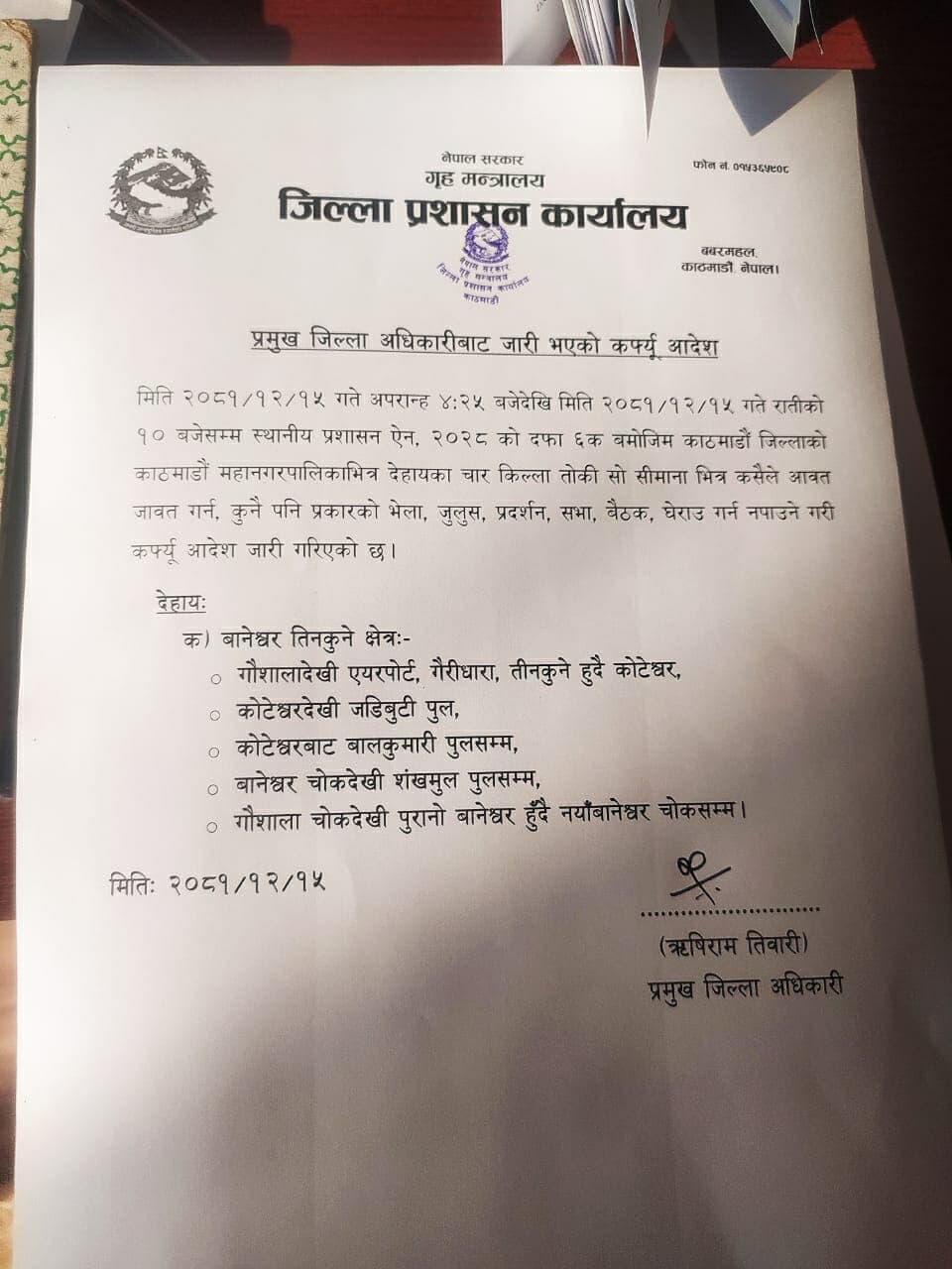 जिल्ला प्रशासन कार्यालय काठमाडौंका प्रवक्त अशोककुमार भण्डारीले शुक्रबार दिउँसो ४ बजेबाट राति १० बजेसम्मका लागि सो क्षेत्रमा कर्फ्यु आदेश जारी गरिएको जानकारी दिए ।
