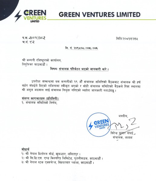 काठमाडौं । ग्रीन भेन्चर्स लिमिटेडको १९ औं सञ्चालक समितिको बैठकको निर्णय अनुसार अमुल अग्रवाललाई नियुक्त गरेको हो ।