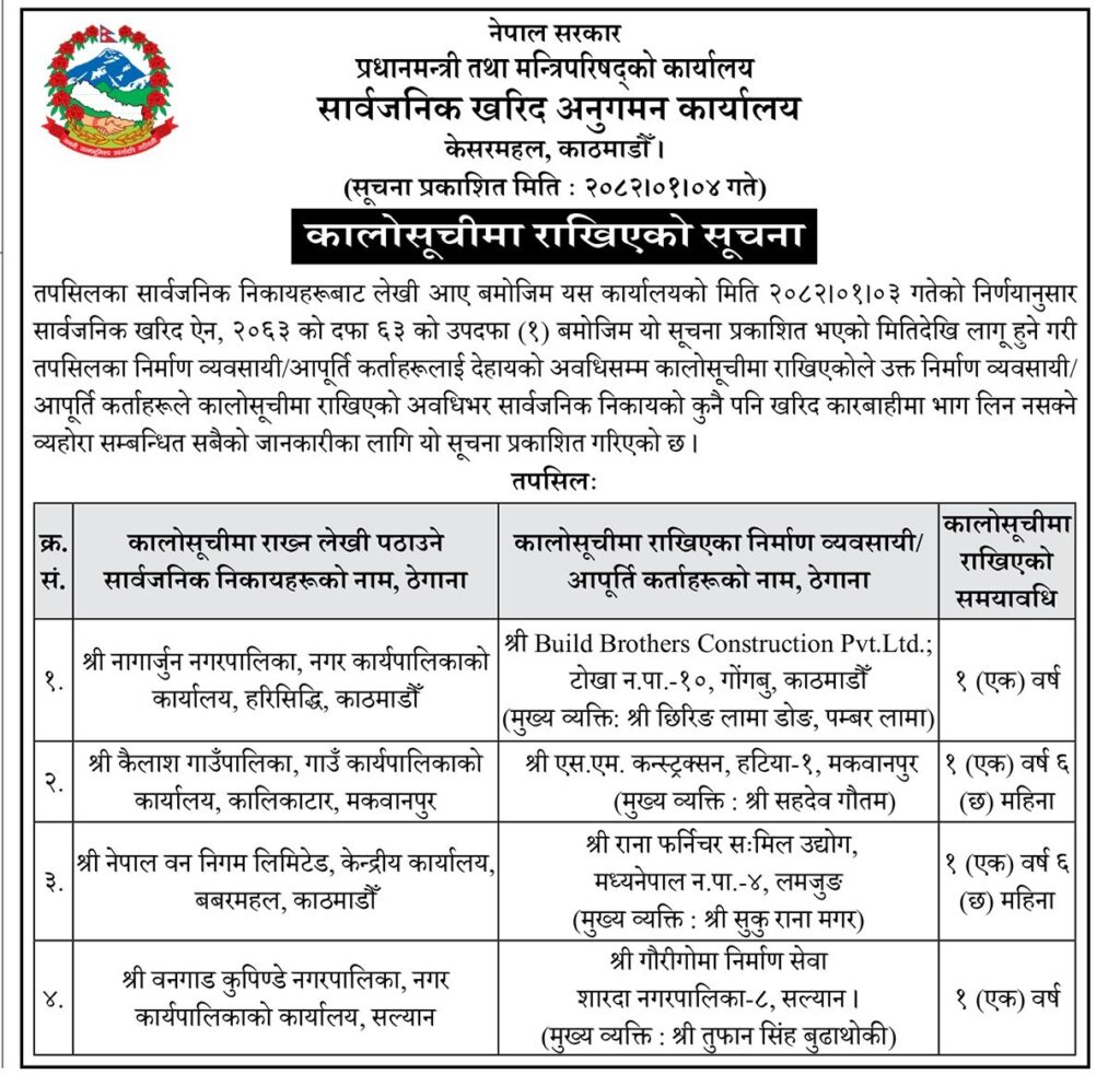 कालोसूचीमा परेका कम्पनीहरूमा छिरिङ लामा डोङ र पम्बर लामा मुख्य व्यक्ति भएको बिल्ड ब्रदर्श कन्स्ट्रक्सन प्रालि गोङ्गबु, सहदेव गौतम मुख्य व्यक्ति भएको एसएम कन्स्ट्रक्सन मकवानपुर, सुकूँ रानामगर मुख्य व्यक्ति भएको राना फर्निचर सःमलि उद्योग मध्यनेपाल लमजुङ र तुफान सिंह बुढाथोकी मुख्य व्यक्ति भएको शारदा नगरपालिका सल्यानको गौरीगोमा निर्माण सेवा छन् । गौरीगोमालाई एक वर्ष र अन्यलाई डेढ वर्षको लागि कालोसूचीमा राखिएको हो ।