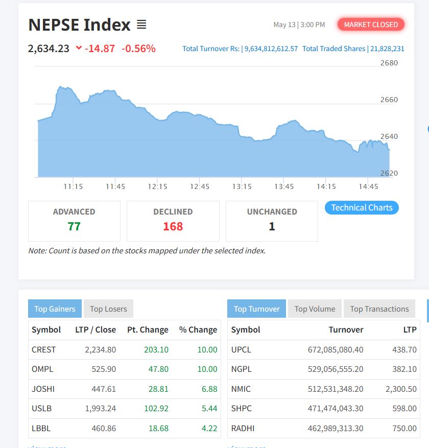 बजार मापन गर्ने सूचक १४.८७ अंकले घटेर परिसूचक २६३४.२३ बिन्दु कायम भएको छ । कारोबारमा अधिकांश समूहको उपसूचक राताम्मे भएको छ । कारोबारमा विकास बैंक, जीवन बीमा, उत्पादन तथा प्रशोधन समूहको उपसूचक बढेको छ भने बाँकी समूहको उपसूचक घटेको छ ।