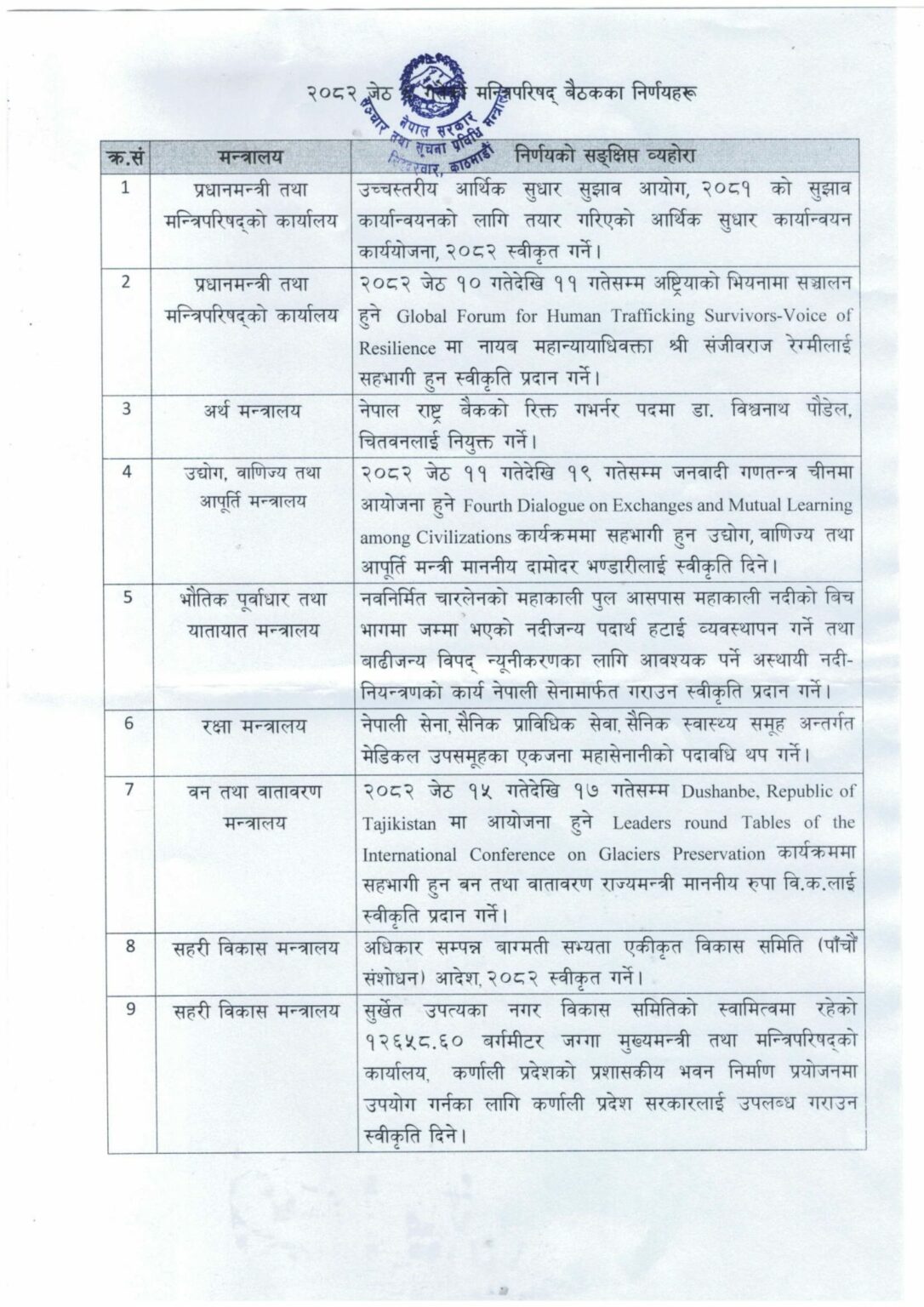 बैठकले जेठ ११ देखि १९ गतेसम्म चीनमा आयोजना हुने एक कार्यक्रममा सहभागी हुन उद्योगमन्त्री दामोदर भण्डारीलाई स्वीकृति दिएको छ ।