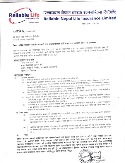 काठमाडौं । रिलायबल नेपाल लाइफ इन्स्योरेन्स लिमिटेडले साधारणसभाको मिति घोषणा गरेको छ । कम्पनीको जेठ ७ गते बसेको सञ्चालक समितिको बैठकले आउँदो असार २ गतेका लागि ८ औँ साधारणसभाको मिति तोकेको हो ।