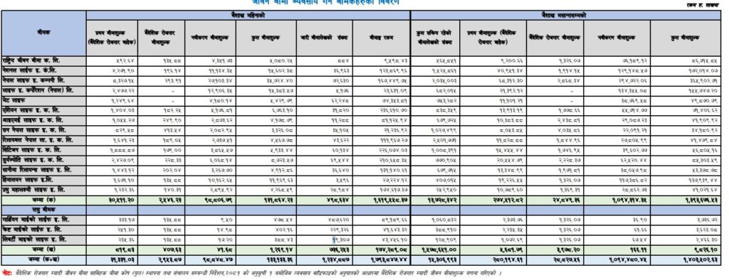 बीमा प्राधिकरणका अनुसार जीवन बीमा तथा लघुबीमाहरुले वैशाख महिनामा मात्रै १३ अर्ब ३१ करोड ३३ लाख रुपैयाँ बीमा शुल्क आर्जन गरेका छन् । एक महिनामा १२ लाख ३४ हजार ८८७ वटा बीमालेख जारी भएको छ ।