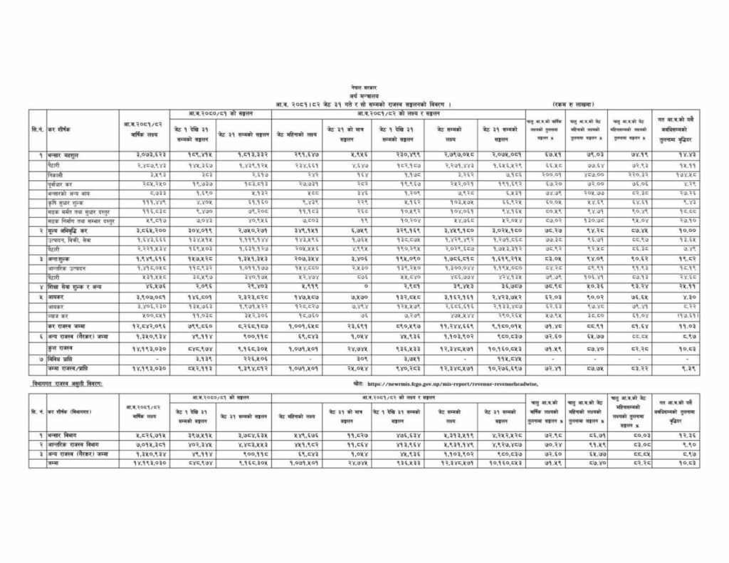 अर्थ मन्त्रालयका अनुसार २०८२ साल असार ३१ गतेसम्म संकलित राजस्व गत वर्षको सोही अवधिको भन्दा ८८ अर्ब रुपैयाँ बढी हो ।
