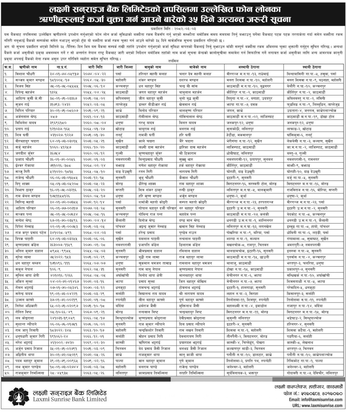 काठमाडौं । लक्ष्मी सनराइज बैंकले आफ्नो ‘फोनलोन’ सुविधाअन्तर्गत लिएको कर्जा समयमा नतिर्ने ५० जना ऋणीहरूको नामावली सार्वजनिक गरेको छ ।