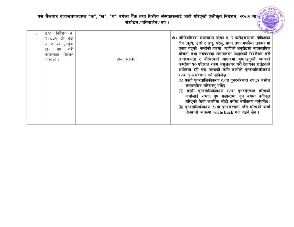 यस्तो पुनरतालिकीकरण /वा पुनरसंरचना २०८२ असोज मसान्तभित्र गरिसक्नु पर्नेछ । यसरी पुनरतालिकीकरण वा पुनरसंरचना गरिएको कर्जालाई २०८१ पुष मसान्तमा जुन वर्गमा वर्गीकृत गरिएको थियो कम्तीमा सोही वर्गमा वर्गीकरण गर्नुपर्ने राष्ट्र बैंकले जनाएको छ । पुनरतालिकीकरण वा पुनरसंरचना अघि गरिएको कर्जा नोक्सानी व्यवस्था गर्न पाइने छैन ।