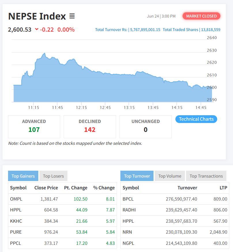 बजार मापन गर्ने सूचक ०.२२ अंकले घटेर परिसूचक २६०० बिन्दु कायम भएको छ। ३१६ कम्पनीको १ करोड ३८ लाख १८ हजार ५५९ कित्ता सेयर ५ अर्ब ७६ करोड ७८ लाख ५० हजार रुपैयाँ सेयर कारोबार भएको छ ।