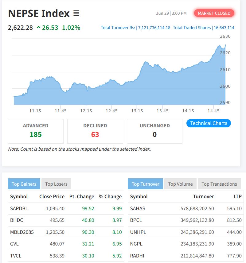 यो दिन बजार मापन गर्ने सूचक २६.५३ अंकले बढेर परिसूचक २६२२.२८ बिन्दु कायम भएको छ । ३२८ कम्पनीको १ करोड ६६ लाख ४३ हजार ११४ कित्ता सयेर ७ अर्ब १२ करोड १७ लाख ३६ हजार ११४ रुपैयाँको कारोबार भएको छ ।