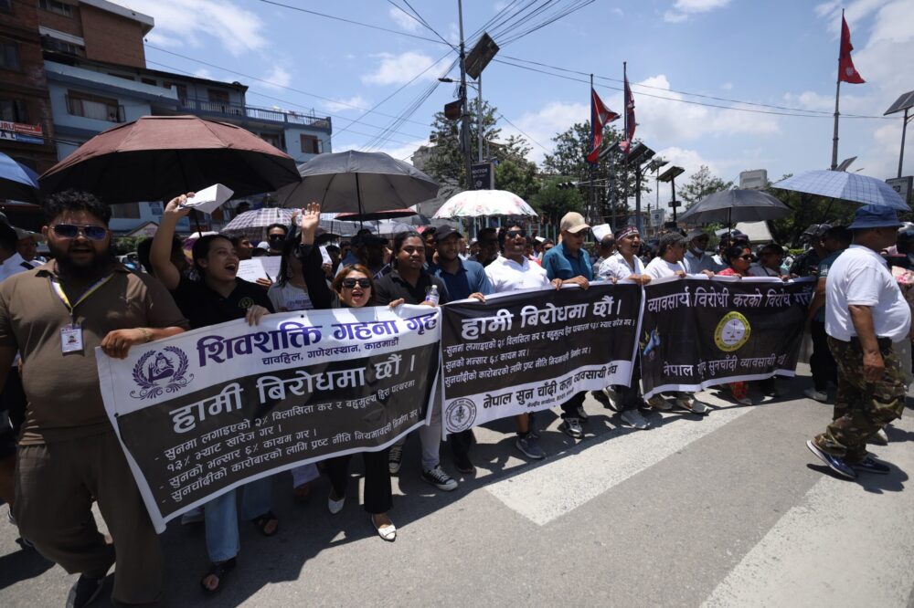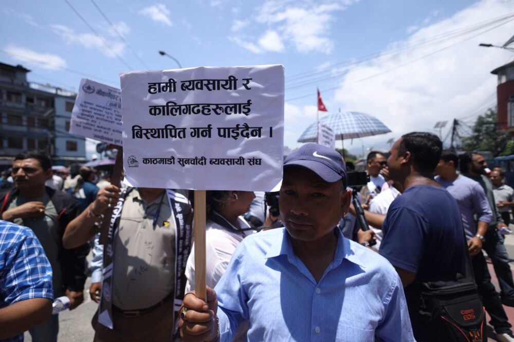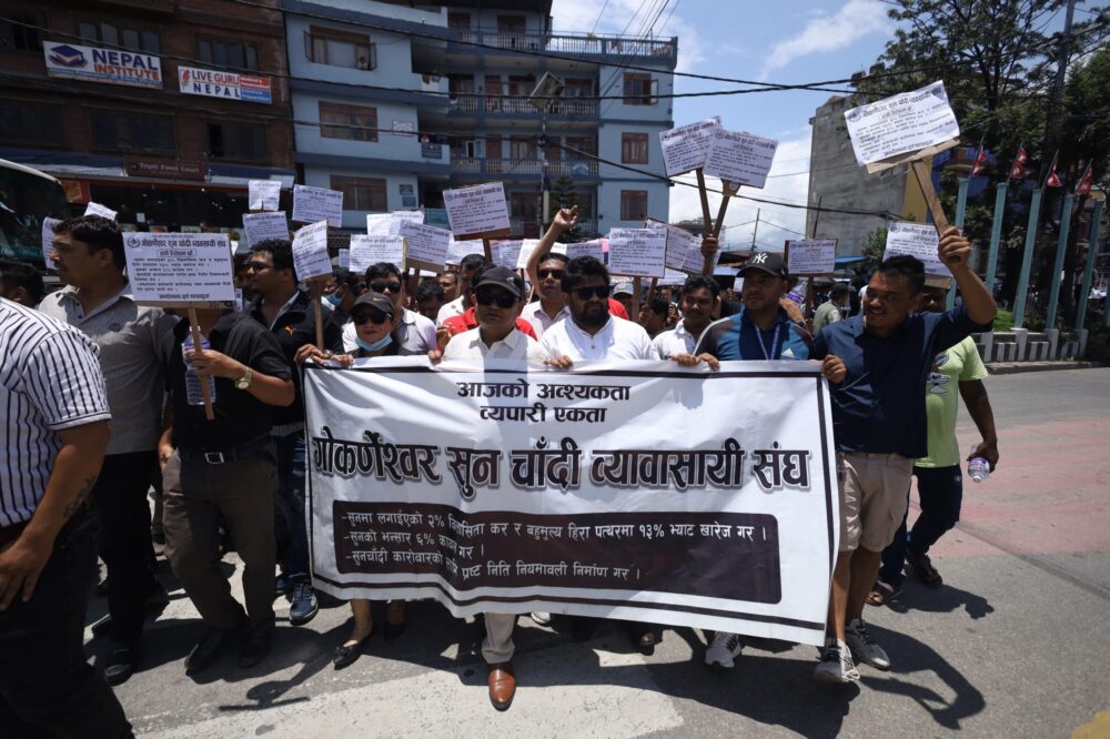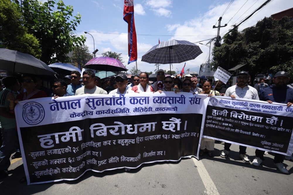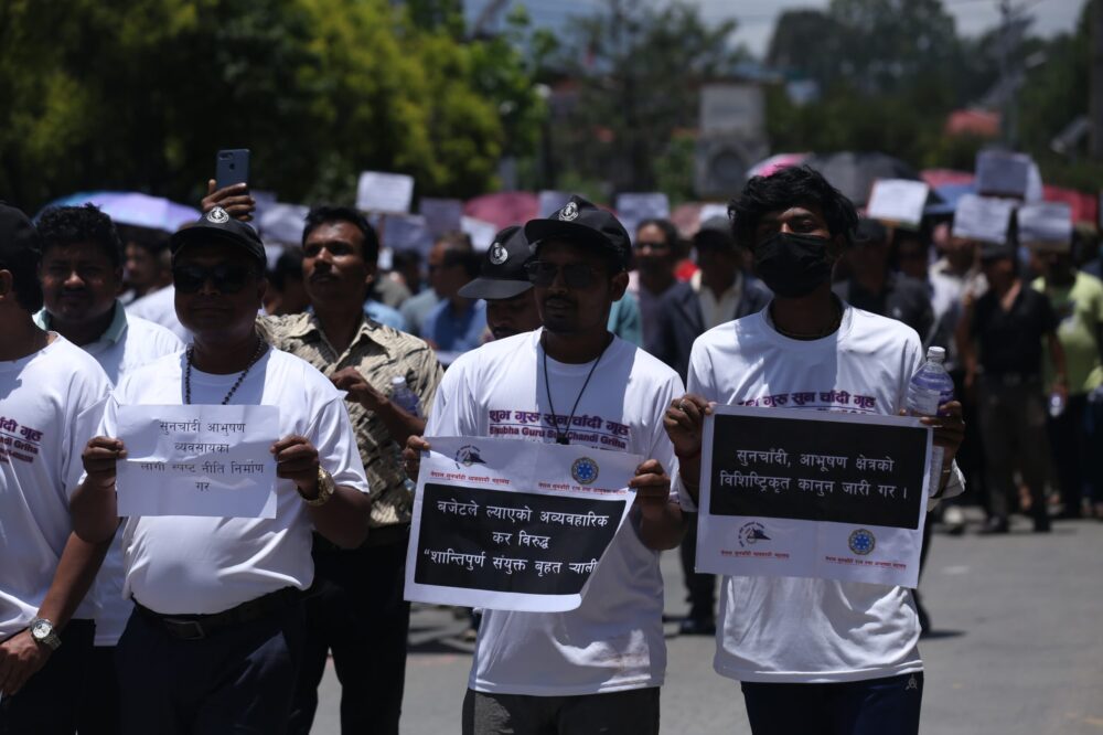 काठमाडौं । नेपाल सुनचाँदी व्यवसायी तथा कालिगढ संघर्ष समितिले सुनमा लगाइएको २ प्रतिशत विलासिता कर खारेजिको माग राखेर प्रदर्शन गरेको छ । हिरा, जुहारत तथा पत्थरमा लगाईएको १३ प्रतिशत भ्याट खारेज गर्नुपर्ने, उपभोक्ता कर्मचारी, कालिगड तथा ब्यबसायि मैत्री ऐन तुररुन्त जारी गर्नुपर्नेलगायत माग उनीहरूको छ।