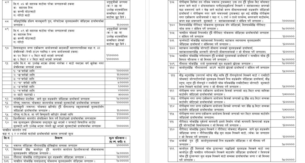 यसै गरी, माइतीघर, सिंहदरबार पश्चिम गेट, पुतलीसडक, कृष्ण पाउरोटी, हात्तीसार, जय नेपाल, कान्ति पथ जमल, दरबारमार्ग र घण्टाघरदेखि कमलादी मोडसम्मका मुलसडकसँग जोडिएका दायाँबायाँका जग्गाहरू ५० लाख रुपैयाँ निर्धारण गरिएको छ ।