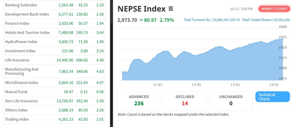 बजार मापन गर्ने सूचक ८०.९७ अंकले बढेर परिसूचक २९७३.७० बिन्दु कायम भएको छ । ३१९ कम्पनीको ४ करोड ३५ लाख ८१ हजार २२८ कित्ता सेयर २० अर्ब ८ करोड ५३ लाख ६७ हजार रुपैयाँको कारोबार भएको छ ।