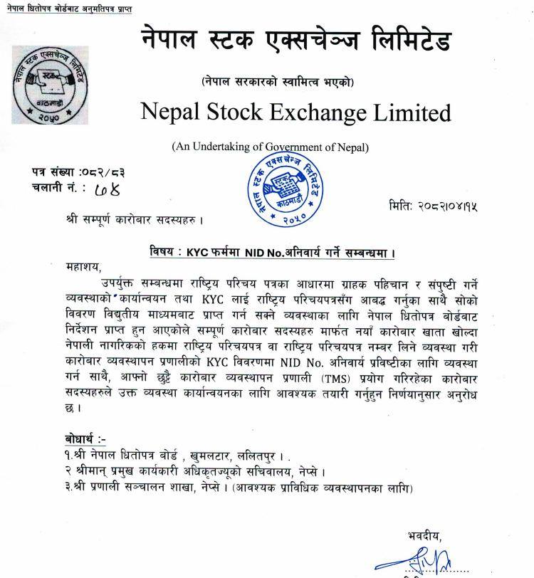 नेपाल स्टक एक्सचेन्ज (नेप्से)ले सार्वजनिक सूचना जारी गर्दै नयाँ कारोबार खाता खोल्दा राष्ट्रिय परिचयपत्र नम्बर अनिवार्य गर्न ब्रोकर कम्पनीहरूलाई पत्राचार गरेको हो।