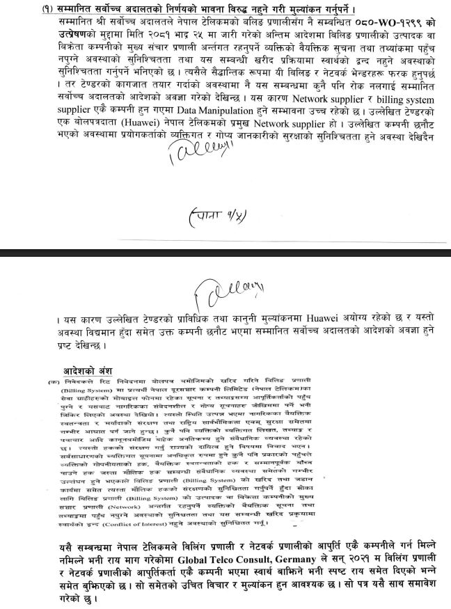यस्तै सर्वोच्च अदालतको निर्णयको भावना विरुद्ध नहुने गरी मुल्यांकन गर्नुपर्ने, सर्वोच्च अदालतले नेपाल टेलिकमको बलिङ प्रणालीसँग नै सम्बन्धित मुद्दामा भदौ २५ गते जारी गरेको अन्तिम आदेशमा बिलिङ प्रणालीको उत्पादक वा विक्रेता कम्पनीको मुख्य संचार प्रणाली अर्न्तगत रहनुपर्ने व्यक्तिको वैयक्तिक सुचना तथा तथ्यांकमा पहुँच नपुग्ने अवस्थाको सुनिश्चितता तथा यस सम्बन्धी खरीद प्रक्रियामा स्वार्थको द्वन्द नहुने अवस्थाको सुनिश्चितता गर्नुपर्ने भनिएको उजुरीमा उल्लेख छ । त्यसैले सैद्धान्तिक रूपमा यी बिलिङ र नेटवर्क भेन्डरहरू फरक हुनुपर्छ । तर टेण्डरको कागजात तयार गर्दाको अवस्थामा नै यस सम्बन्धमा कुनै पनि रोक नलगाई सर्वोच्च अदालतको आदेशको अवज्ञा गरेको उल्लेख छ ।
