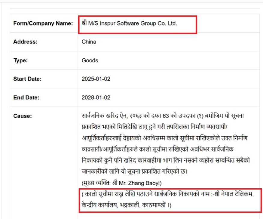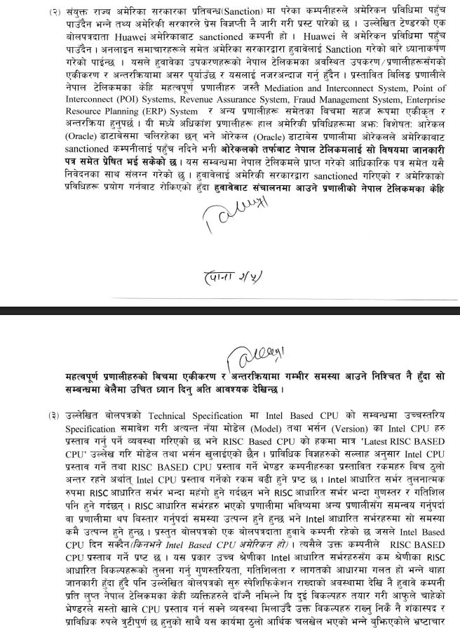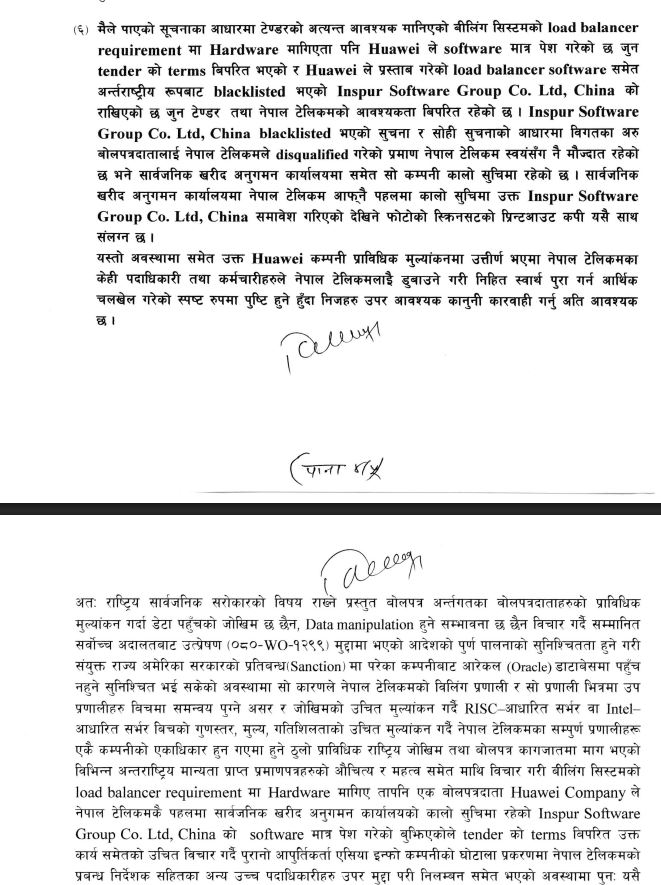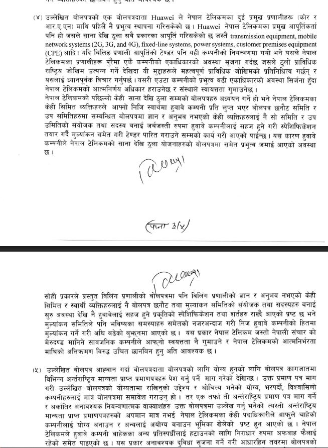 यस कारण नेटवर्क सप्लायर र बलिलङ सिस्टम सप्लायर एकै कम्पनी हुन गएमा डेटा म्यानुपुलेसन हुने सम्भावना उच्च रहेको छ । टेण्डरको एक बोलपत्रदाता हुवावे नेपाल टेलिकमको प्रमुख नेटवर्क सप्लायर भएको उल्लेख छ । उल्लेखित कम्पनी छनौट भएको अवस्थामा प्रयोगकर्ताको व्यक्तिगत र गोप्य जानकारीको सुरक्षाको सुनिश्चितता नहुने उजुरीमा उल्लेख छ ।
