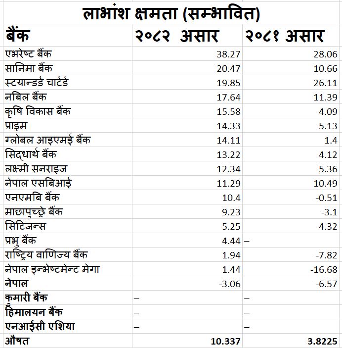 सञ्चालनमा रहेका २० वाणिज्य बैंकमा ४ वटा बाहेकका बैंकले सेयरधनीलाई लाभांश दिन सक्नेछन् । गत आवको आवको नाफाबाट बैंकको लाभांश दिने क्षमता १.४४ देखि ३८.२७ प्रतिशतसम्म लाभांश दिने सक्ने क्षमता रहेको छ ।