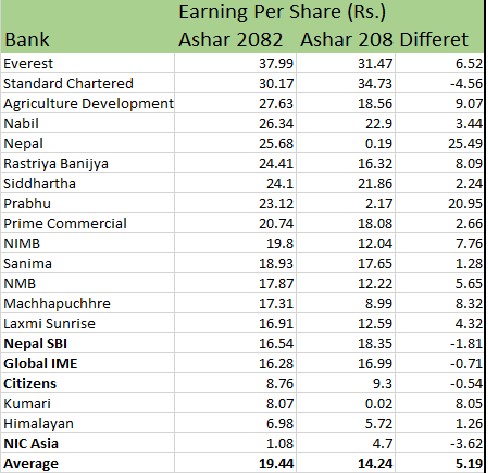 गत आवमा सबैभन्दा धेरै ईपीएस भएको बैंक एभरेष्ट बैंक रहेको छ । यस बैंकको ईपीएस गत आवमा ३७ रुपैयाँ ९९ पैसा रहेको छ । बैंकको ईपीएस अघिल्लो आवको तुलनामा  ६ रुपैयाँ ५२ पैसाले बढेको हो । अघिल्लो आवमा यस बैंकको ईपीएस ३१ रुपैयाँ ४७ पैसा रहेको थियो ।