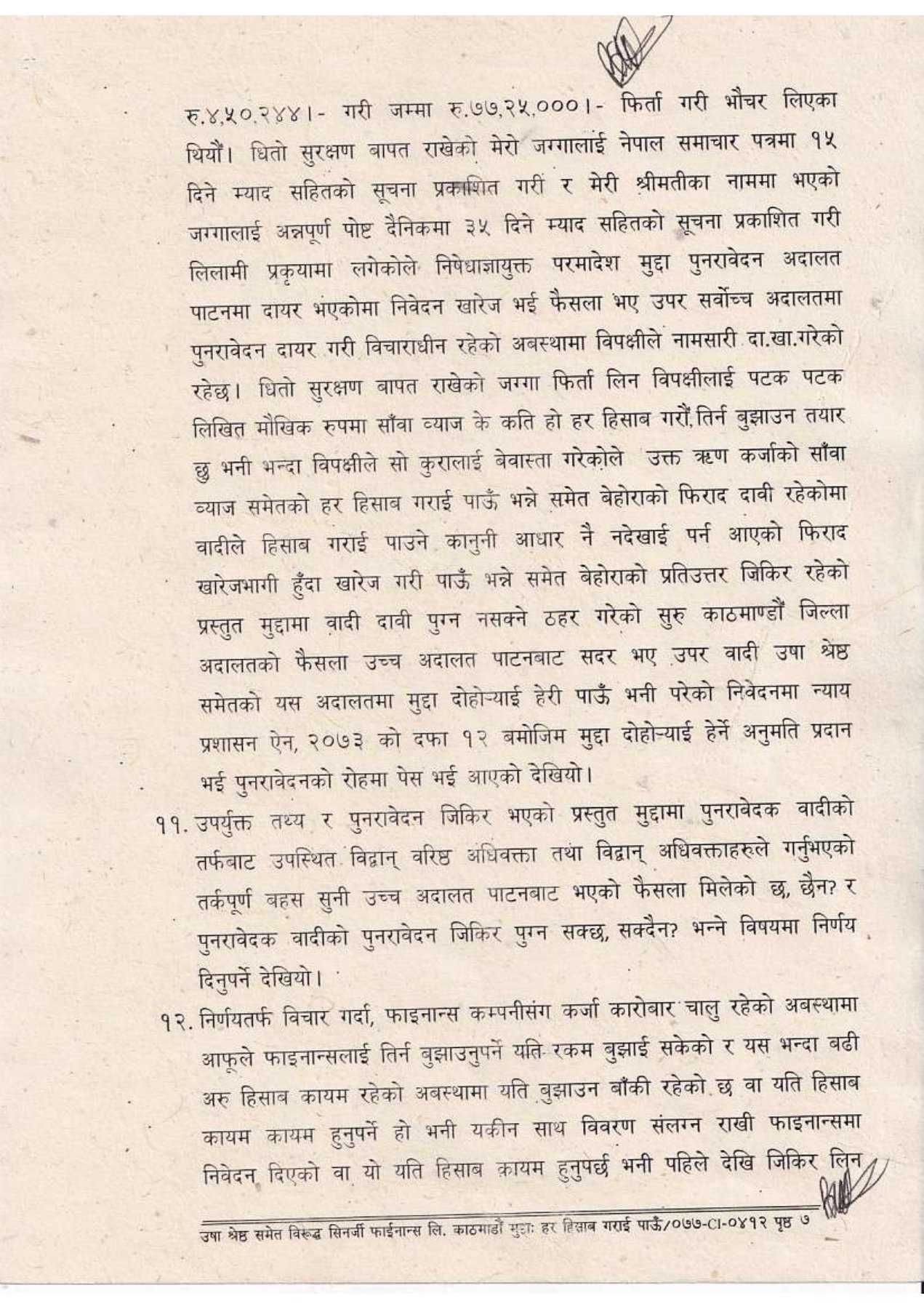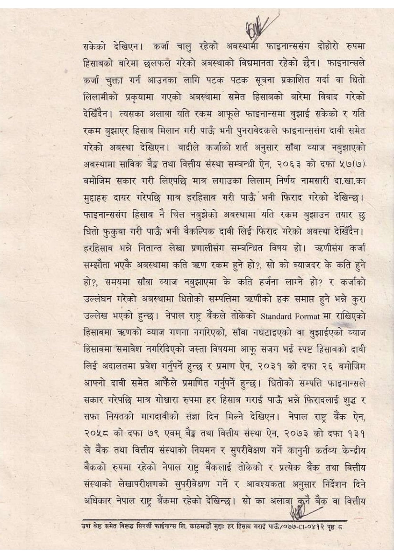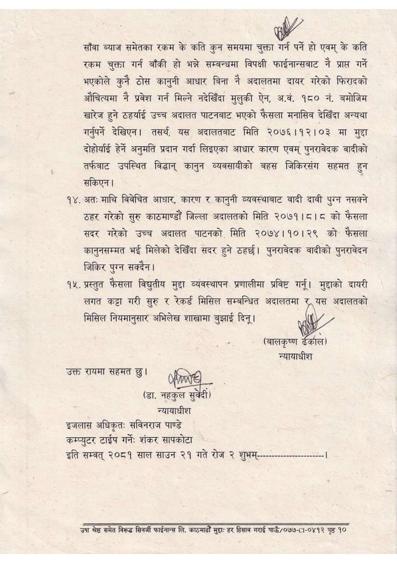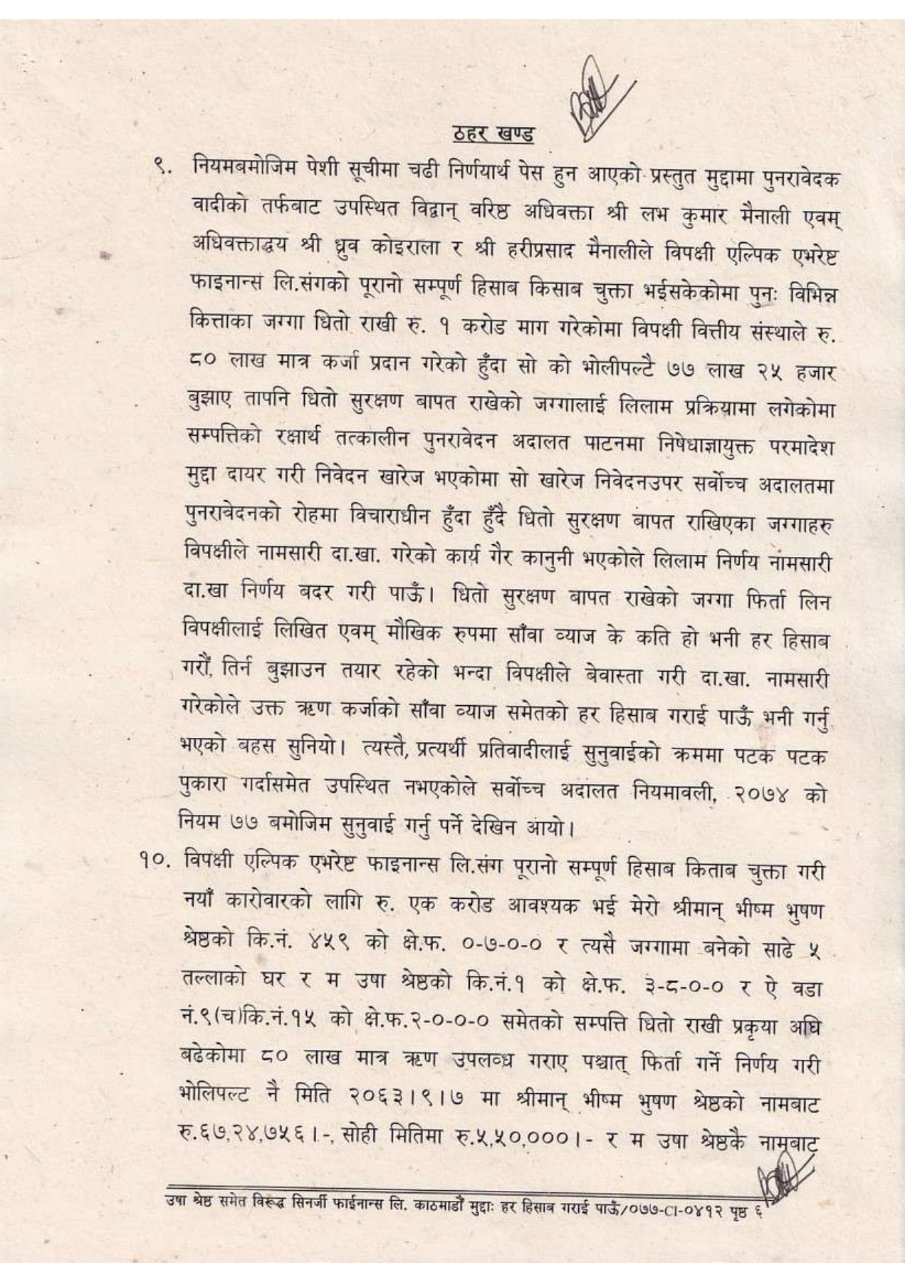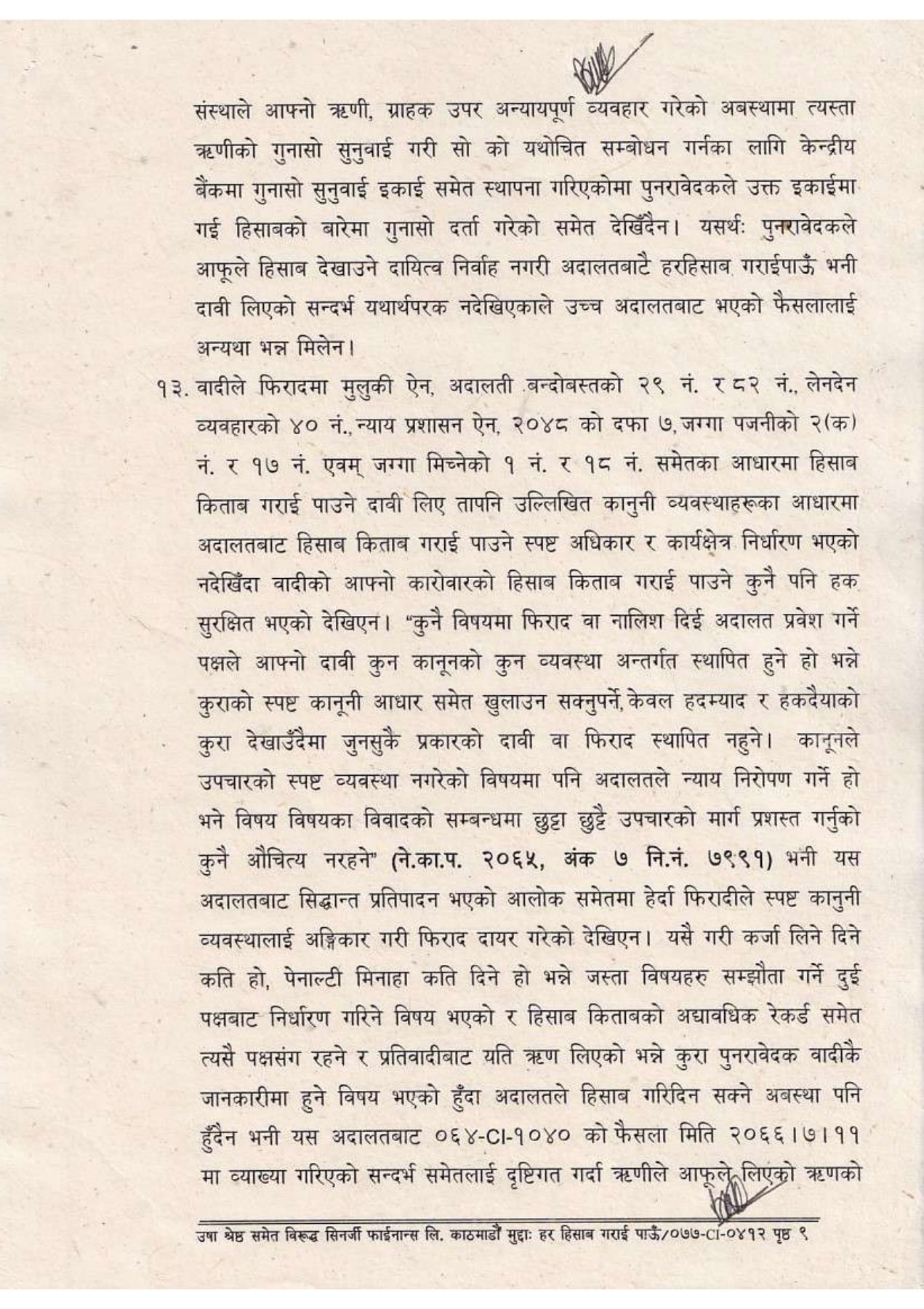 सर्वोच्चले काठमाडौं जिल्ला अदालतको २०७१ मङ्सिर ८ को फैसला र उच्च अदालत पाटनको २०७४ माघ २९ को फैसला दुवै सदर गर्दै उषा श्रेष्ठको पुनरावेदन दाबी पुग्न नसक्ने ठहर गरेको छ । सर्वोच्चले सिनर्जी फाइनान्स लिमिटेड तत्कालीन (एल्पिक एभरेष्ट फाइनान्स) सँगको धितो र कर्जा विवादमा उषा श्रेष्ठलगायतको दाबी अस्वीकार गर्दै उच्च अदालत पाटनको फैसला सदर गरेको हो । सर्वोच्चले वादीले ‘हिसाब–किताब गरिदिनू’ भन्ने दाबीका लागि ठोस कानुनी आधार प्रस्तुत नगरेको ठहर गर्दै, अदालतमार्फत त्यस्तो माग पूरा गर्न नसकिने प्रष्ट पारेको छ ।