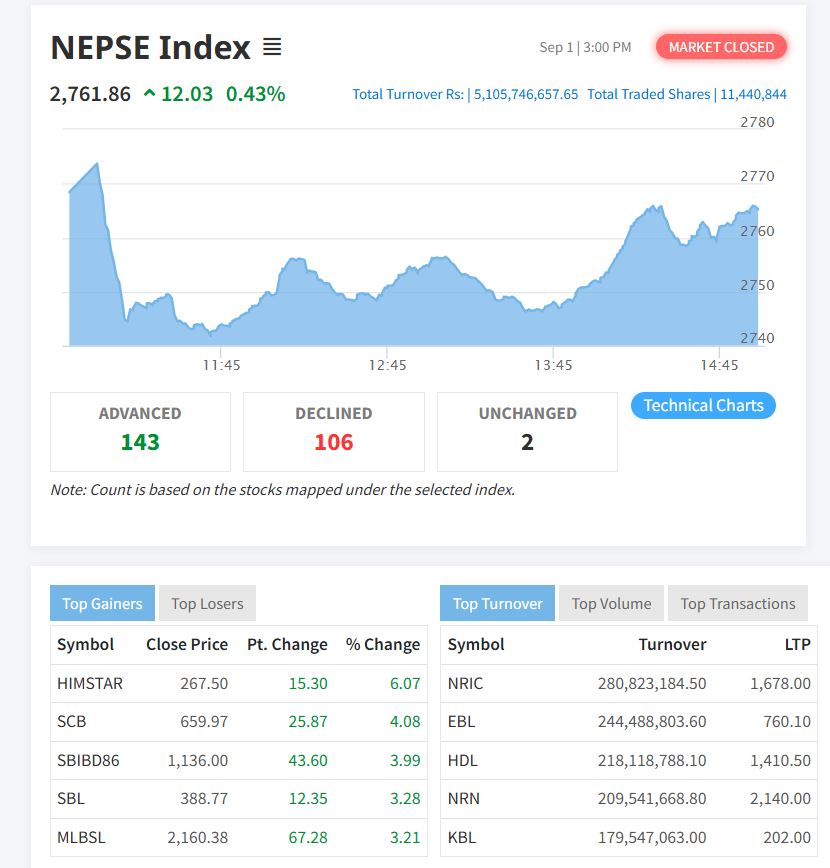 ३२६ कम्पनीको १ करोड १४ लाख ४० हजार ८४४ कित्ता सेयर ५ अर्ब १० करोड ५७ लाख ४६ हजार ६५७ रुपैयाँको सेयर कारोबार भएको छ । कारोबारमा अन्य बाहेक सबै समूहको उपसूचक बढेको छ ।