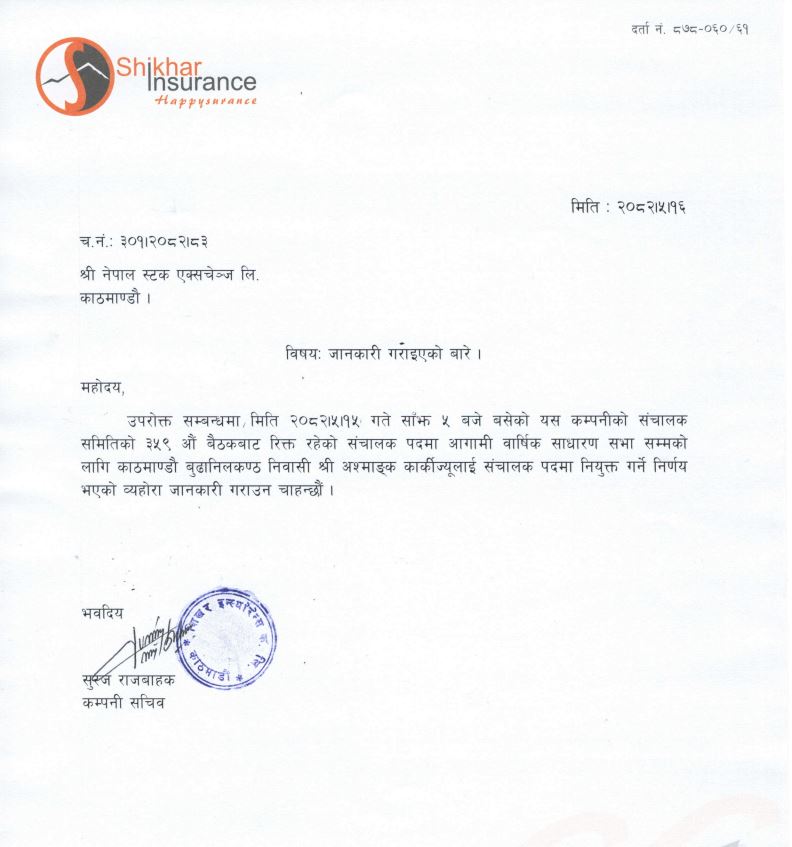 काठमाडौं । शिखर इन्स्योरेन्स लिमिटेडले सञ्चालकमा अश्मांक कार्कीलाई नियुक्त गरेको छ ।