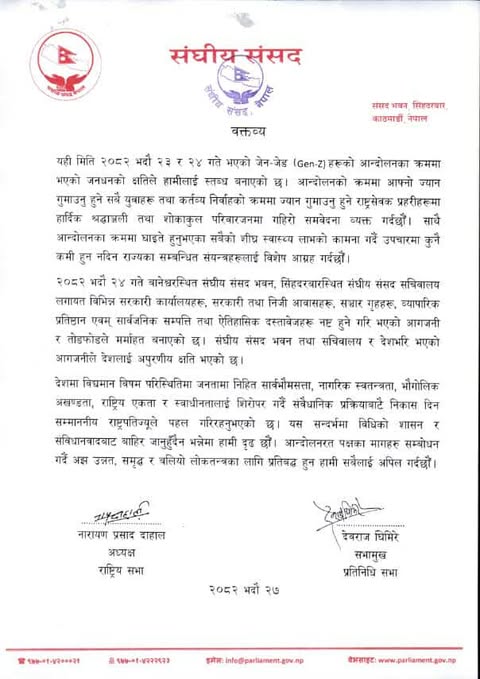 काठमाडौंं । प्रतिनिधिसभाका सभामुख देवराज घिमिरे र राष्ट्रियसभाका अध्यक्ष नारायणप्रसाद दाहालले संवैधानिक प्रक्रियाबाट नै निकास दिन राष्ट्रपति रामचन्द्र पौडेलले पहल गरिरहेका जनाएका छन् । शुक्रबार संयुक्त वक्तव्य जारी गर्दैै उनीहरूले संघीय संसद् भवन तथा सचिवालय र देशभरि गरिएको आगजनीबाट मुलुकलाई अपूरणीय क्षति पुगेको उल्लेख गरेका छन् ।