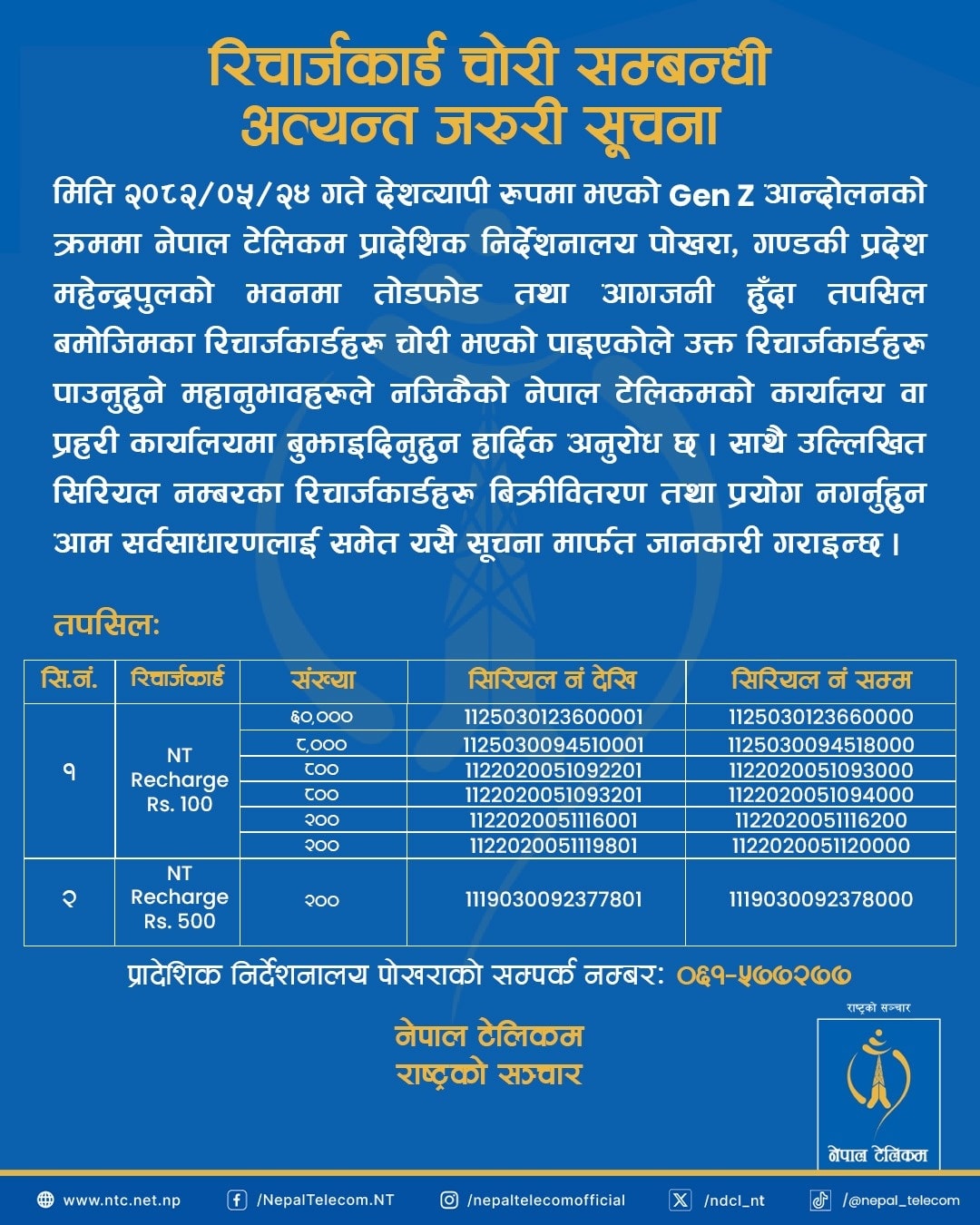 काठमाडौं । जेनजी आन्दोलनका क्रममा गण्डकी प्रदेशको महेन्द्रपुलस्थित नेपाल दूरसञ्चार कम्पनीको प्रदेश निर्देशनालय भवनमा तोडफोड तथा आगजनी हुँदा १ सय रुपैयाँ मूल्यका ७० हजार र ५ सय रुपैयाँ मूल्यका करिब २ सय कार्ड चोरी भएका छन् ।