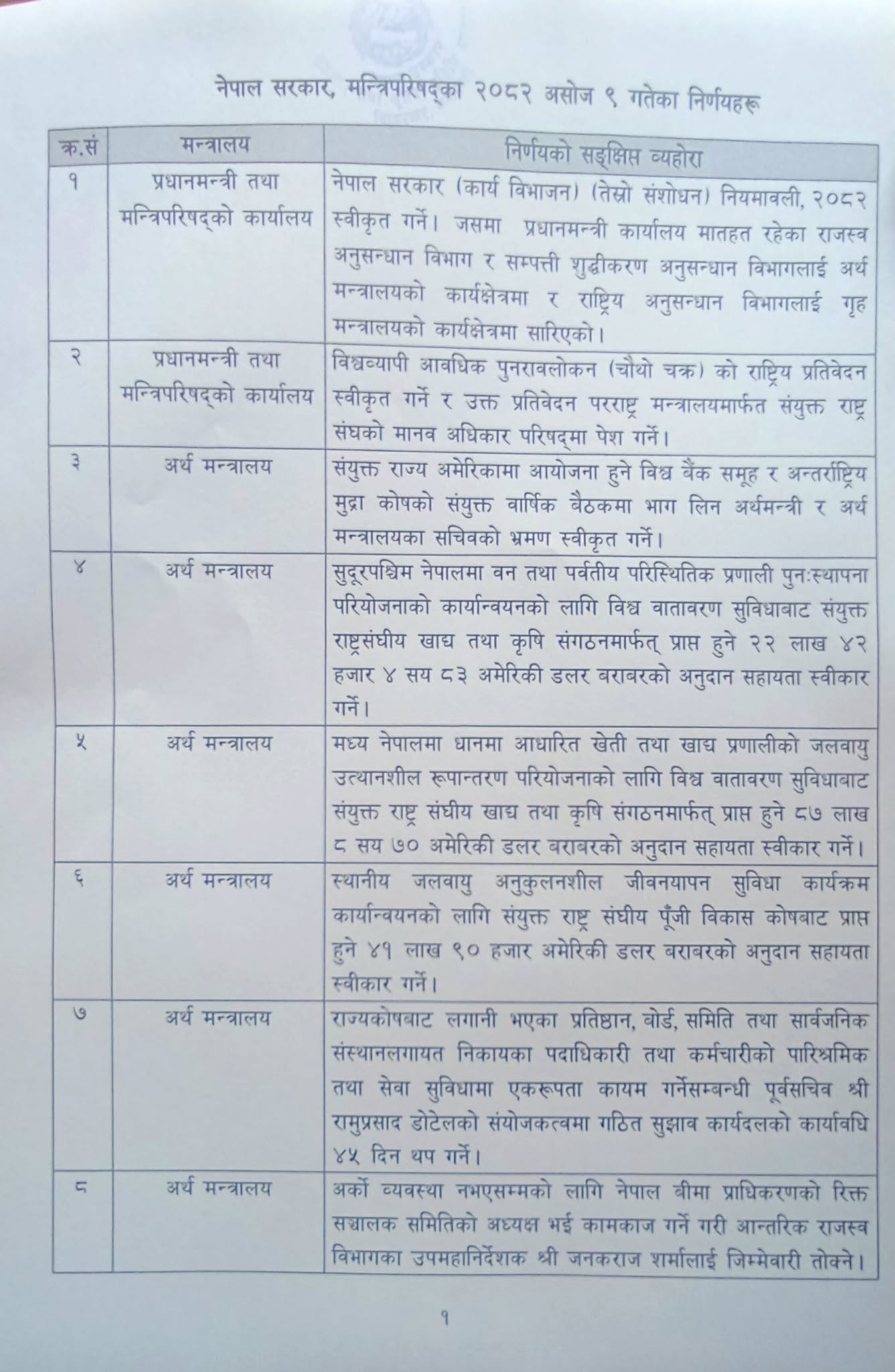 सञ्चारमन्त्री खरेलका अनुसार बैठकले प्रधानमन्त्री कार्यालय मातहत रहेका राजश्व अनुसन्धान विभाग र सम्पत्ति शुद्धीकरण अनुसन्धान विभागलाई अर्थमन्त्रालयको कार्यक्षेत्र र राष्ट्रिय अनुसन्धान विभागलाई गृह मन्त्रालयको कार्यक्षेत्रमा सारिएको छ।