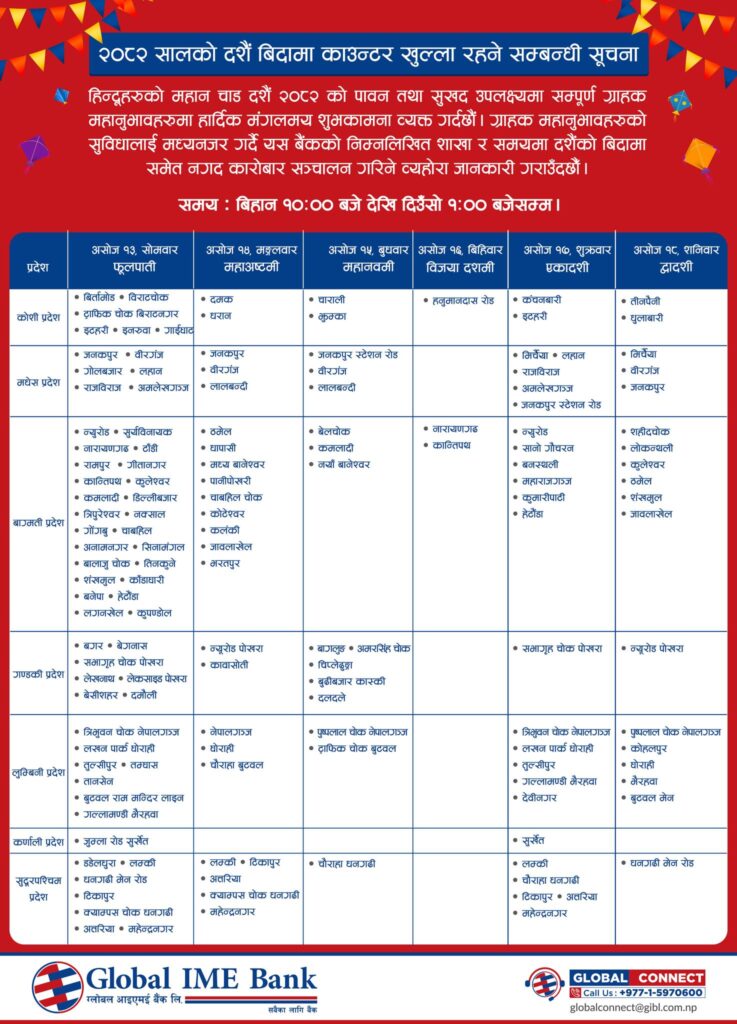 ग्लोबल आईएमई बैंकको फूलपातीको दिन कोशी प्रदेशमा ८, मधेस प्रदेशमा ६, बागमती २४, गण्डकी प्रदेशमा ७ वटा शाखा, लुम्बिनी प्रदेशमा ७ वटा, कणाली प्रदेशमा १, सुदूरपश्चिम प्रदेशमा ७ वटा शाखाबाट बैंकले सेवा विस्तार गर्ने जानकारी दिएको छ । यसैगरी, ग्लोबलले महाअष्टमीको दिन कोसीबाट २ वटा, महेशबाट ३ वटा, बागमतीबाट, ९ वटा, गण्डकीबाट २ वटा, लुम्बिनीबाट ३ वटा, सुदूरपश्चिमबाट ४ वटा सञ्चालन गर्ने बैंकले जनाएको छ ।