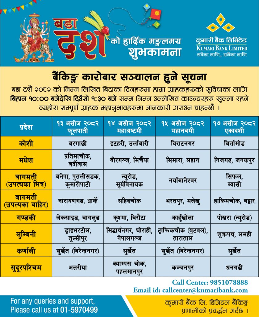 यसैगरी, कुमारी बैंकले दशैका विभिन्न दिनमा कोशी प्रदेशका ८ वटा शाखा, मदेशको २ वटा, बागमतीका १४, गण्डकीको १, लुम्बिनीको ४, कर्णालीको १ र सुदूरपश्चिमको १ शाखा सञ्चालनमा रहने जानकारी दिएको छ।