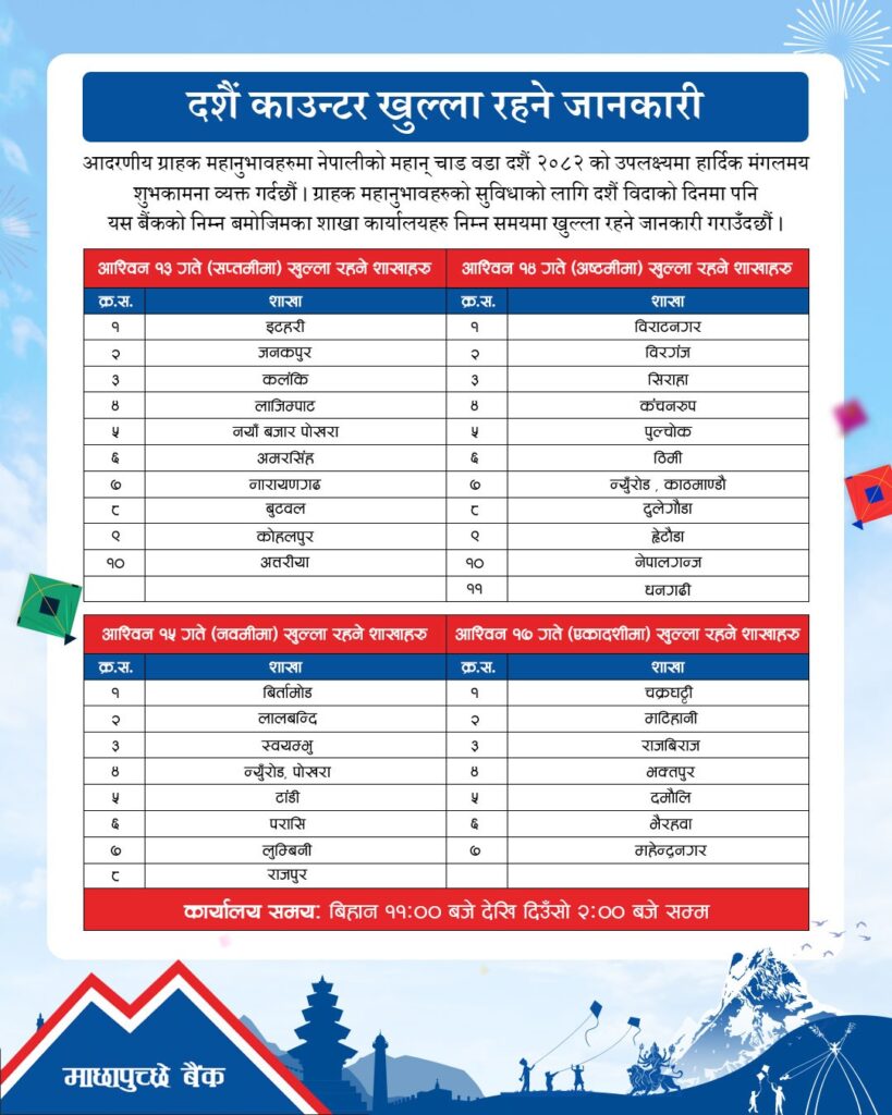 माछापुच्छ्रे बैंकले फूलपातीमा १० शाखा खोल्ने, अष्टमीमा ११ वटा शाखा र नवमीमा ८ वटा शाखा खोल्ने जानकारी दिएको छ । टीकाको दिन बैंकको कुनै पनि शाखा खुल्दैन । टीकाको भोलिपल्ट बैंकको ७ वटा शाखा सञ्चालनमा रहने छ ।