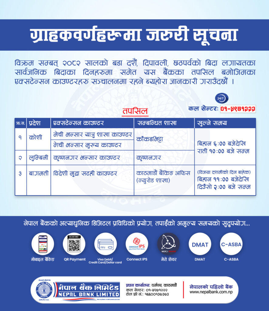 दशैं बिदाको समयमा पनि बैंक तथा वित्तीय संस्थाले आफ्नो शाखा तथा काउन्टर खुला गरेर सेवा दिने भएका छन् । विशेष गरी वाणिज्य बैंकहरुले सर्वसाधारणलाई सहज होस् भन्ने उद्देश्यले बिदाका दिनमा पनि बैंक काउन्टर खोल्न लागेका हुन् ।
