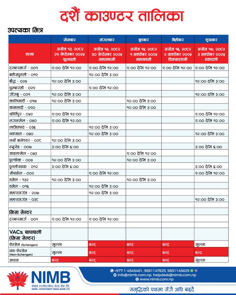 नेपाल इन्भेस्टमेन्ट मेगा बैंकले दशैका विभिन्न दिनमा आफ्ना २२ वटा शाखा सञ्चालनमा नै रहने जानकारी दिएको छ ।