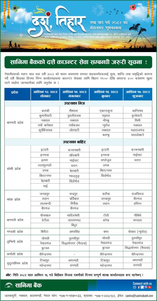 दसैंमा वाणिज्य बैंकले कुन–कुन शाखाबाट सेवा दिँदै छन् ?