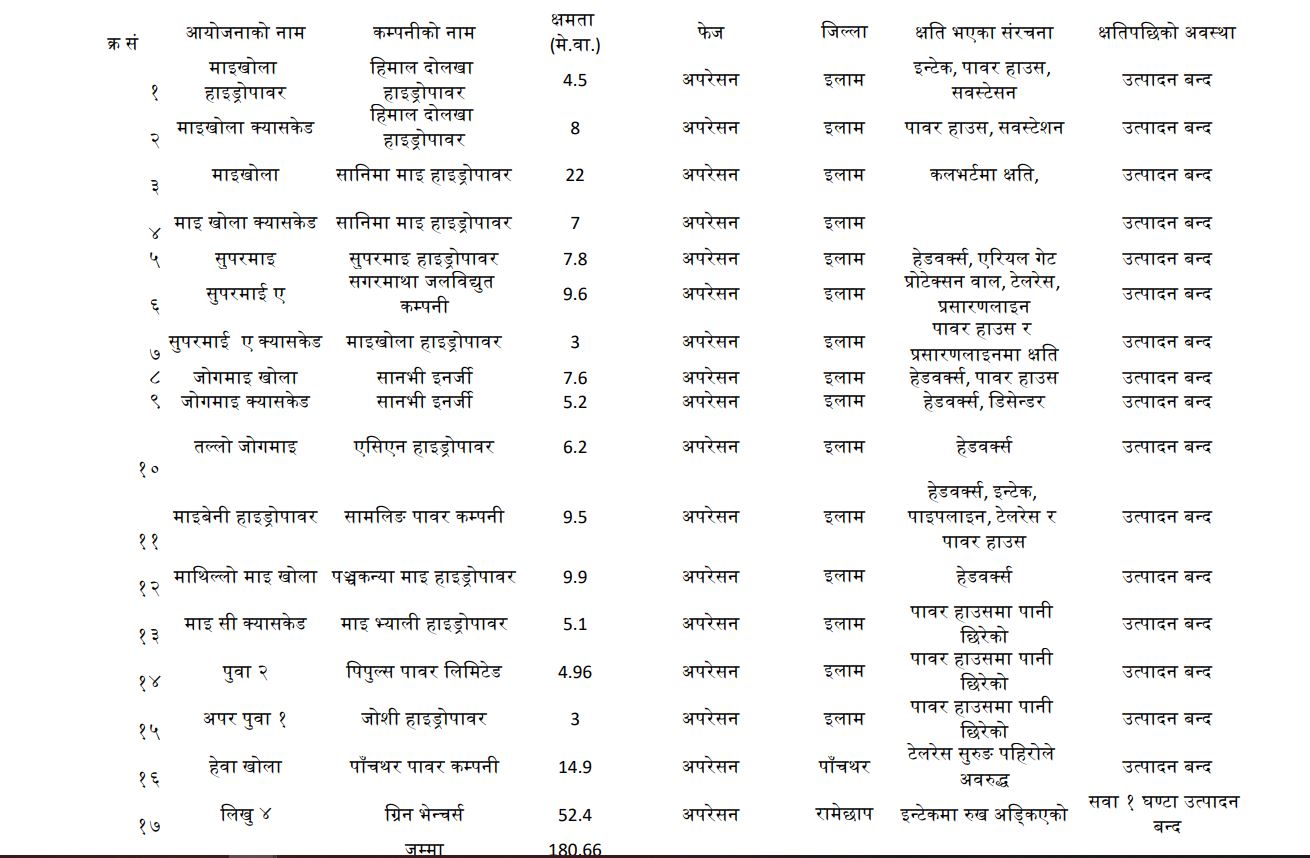 बाढी पहिरोका कारण सबैभन्दा बढी प्रभावित भएको कोशी प्रदेशको इलाम जिल्लामा जलविद्युत आयोजनाहरु पनि सबैभन्दा धेरै प्रभावित भएका छन् । इलाममा मात्रै सञ्चालनमा आएका १५ वटा जलविद्युत आयोजनाहरुको उत्पादन बन्द भएको छ ।