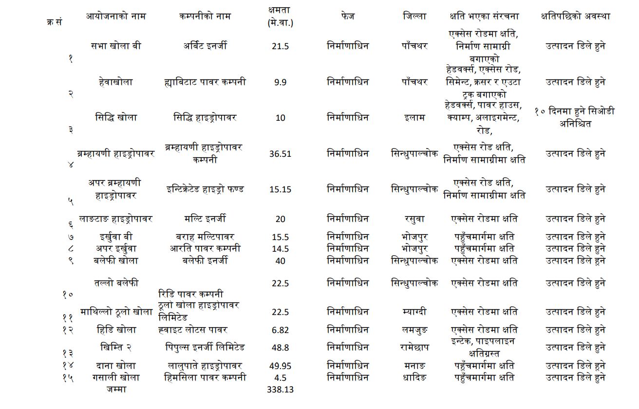 रसुवामा रहेको २० मेगावाटको लाङटाङ खोला, भोजपुरमा रहेको १५.५ मेगावाटको इर्खुवा खोला बी, १४.५ मेगावाटको माथिल्लो इर्खुवा, म्याग्दीमा रहेको २२.५ मेगावाटको माथिल्लो ठूलो खोला, लमजुङमा रहेको ६.८२ मेगावाटको हिडी खोला, रामेछापमा रहेको ४८.८ मेगावाटको खिम्ति २ र धादिङमा रहेको ४.५ मेगावाटको गसाली खोला जलविद्युत आयोजनाको पहुँचमार्ग लगायतका विभिन्न संरचनामा क्षति पुगेका कारण यी आयोजनाको विद्युत उत्पादन मिति पर सरेको छ ।