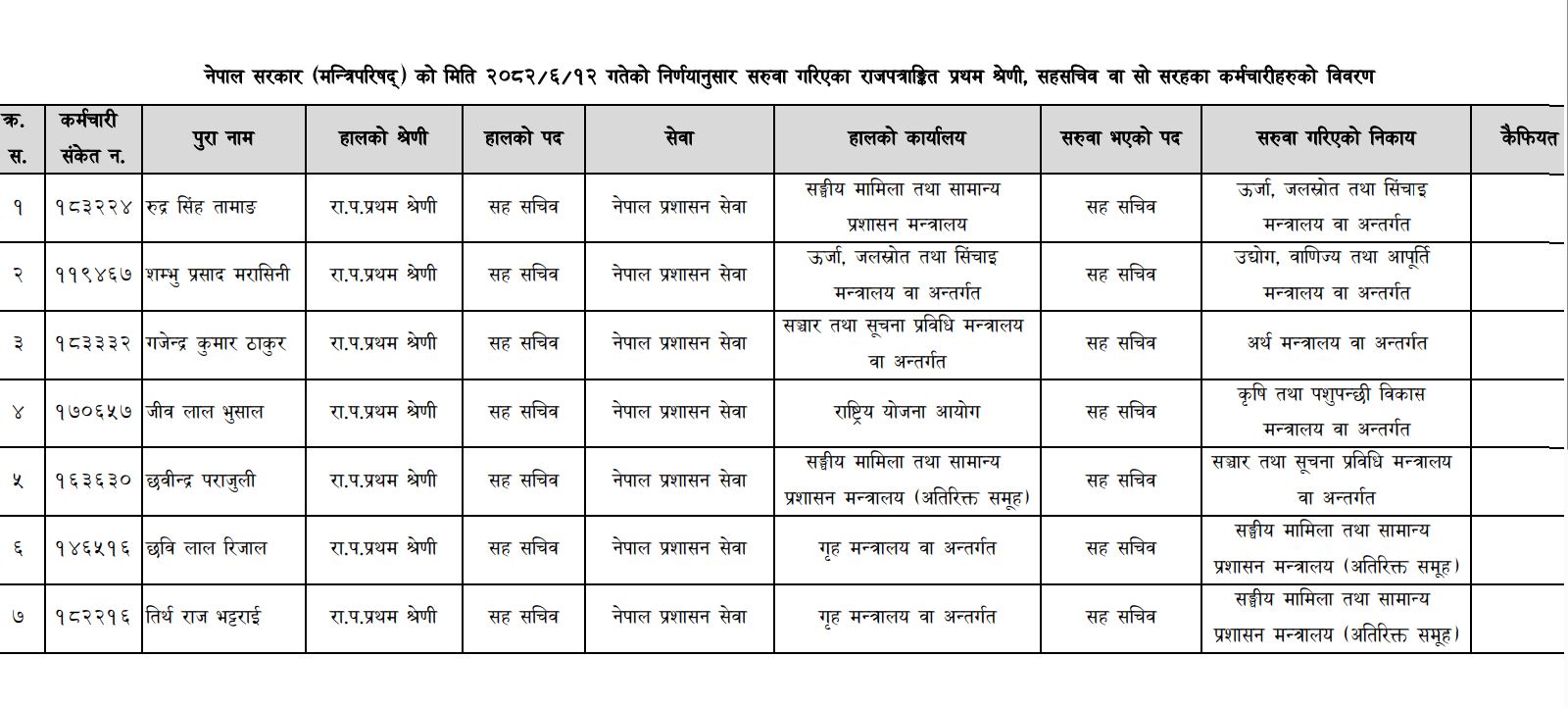 सङ्घीय मामिला मन्त्रालयका छवीन्द्र पराजुली, गृह मन्त्रालयका छविलाल रिजाल र गृह मन्त्रालयका तीर्थराज भट्टराईको सरुवा गरिएको हो ।