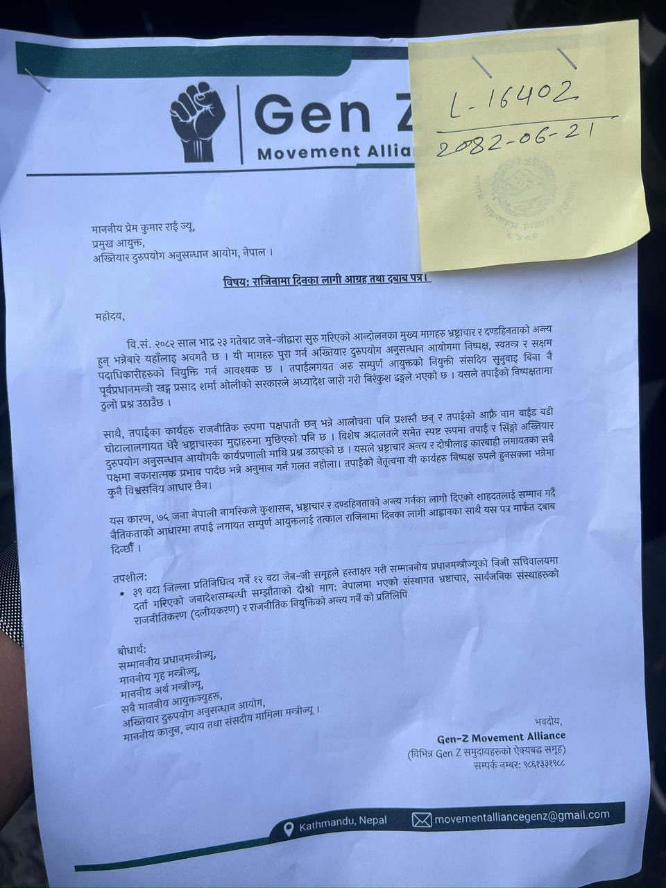 ‘विसं २०८२ साल भाद्र २३ गतेबाट जने-जीद्वारा सुरु गरिएको आन्दोलनका मुख्य मागहरु भ्रष्ट्राचार र दण्डहिनताको अन्त्य हुन् भन्नेबारे यहाँलाइ अवगतै छ । यी मागहरु पुरा गर्न अख्तियार दुरुपयोग अनुसन्धान आयोगमा निष्पक्ष, स्वतन्त्र र सक्षम पदाधिकारीहरुको नियुक्ति गर्न आवश्यक छ । तपाईंलगयत अरु सम्पुर्ण आयुक्तको नियुक्ती संसदिय सुनुवाइ बिना नै पूर्वप्रधानमन्त्री खड्ग प्रसाद शर्मा ओलीको सरकारले अध्यादेश जारी गरी निरंकुश ढङ्गले भएको छ । यसले तपाईंको निष्पक्षतामा ठुलो प्रश्न उठाउँछ ।