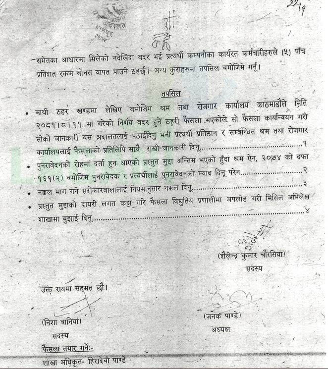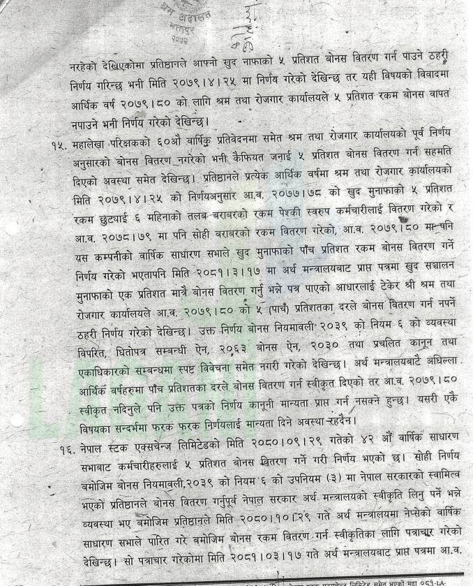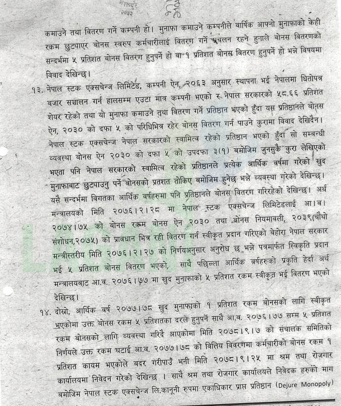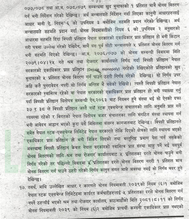 अदालतको आदेशमा भनिएको छ–उल्लेखित आधार र कारणले बोनस नियमावली २०३९ को नियम (६) १ बमोजिम नेपाल स्टक एक्सचेन्ज लिमिटेडमा कार्यरत कर्मचारीहरुलाई ५ प्रतिशतका दरले बोनस वितरण गर्न नपर्ने ठहर भएको श्रम तथा रोजगार कार्यालय, काठमाडौंको मिति २०८१-८-११ को निर्णय बोनस नियमावली २०३९ को नियम (६)२ बमोजिम प्रत्यर्थी कम्पनी एकाधिकार प्राप्त नभएको समेतका आधारमा मिलेको नदेखिँदा बदर भई प्रत्यर्थी कम्पनीका कार्यरत कर्मचारीहरुले (५) पाँच प्रतिशत–रकम बोनस बापत पाउने ठहर्छ’ भन्ने उल्लेख छ । तर, नेप्से सञ्चालक समितिले अदालतको आदेश नमानी मन्त्रालयले निर्णय गर्नुपर्ने अडान लिएको छ । हाल नेप्सेमा सरकारको ५८.६६ प्रतिशत सेयर स्वामित्व छ ।
