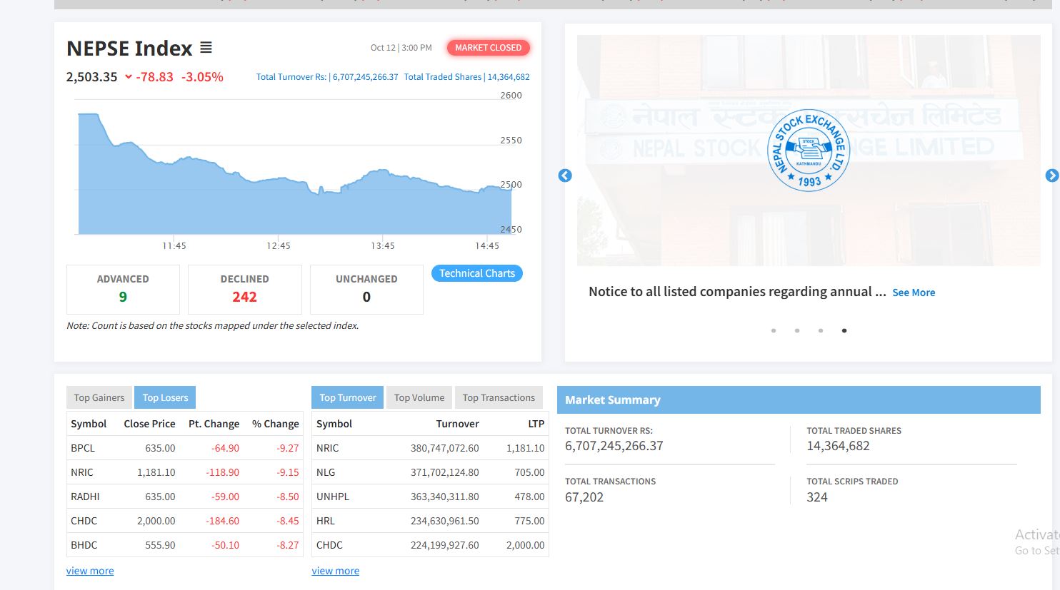 आज साताको पहिलो कारोबार दिन बजारमा पहिरो नै चलेको छ । बजार मापन गर्ने सूचक ७८.८३ अंकले घटेर परिसूचक २५०३.३५ बिन्दु कायम भएको छ । कारोबारको सुरुदेखि घट्न थालेको बजार अन्तिमसम्म कायमे रह्यो । कारोबार अवधि बजार राताम्मे बन्यो । कारोबारमा सबै समूहका उपसूचक राताम्मे भएका छन् ।