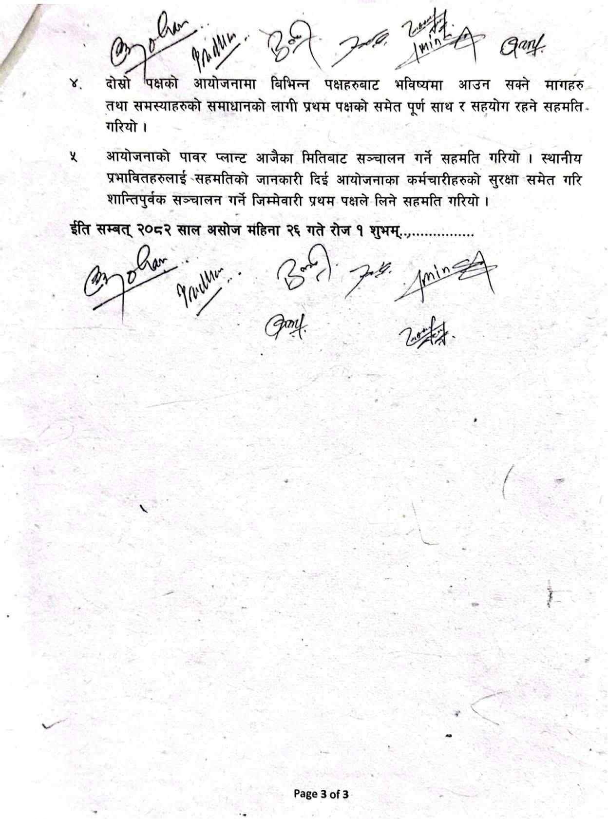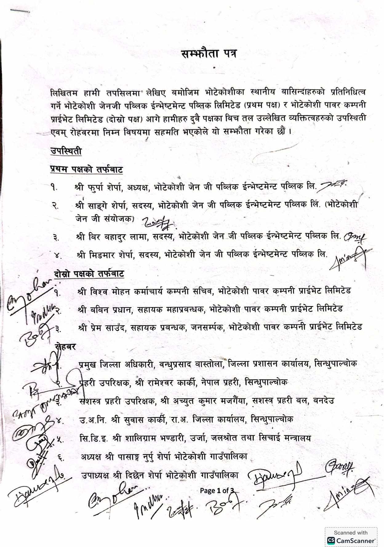 आइतबार स्थानीय जनप्रतिनिधि, प्रमुख जिल्ला अधिकारी, जेजनी पब्लिक इन्भेष्टमेन्ट र भोटेकोशी पावरका प्रतिनिधिसहितको उपस्थितिमा उक्त सम्भौता भएको हो ।
