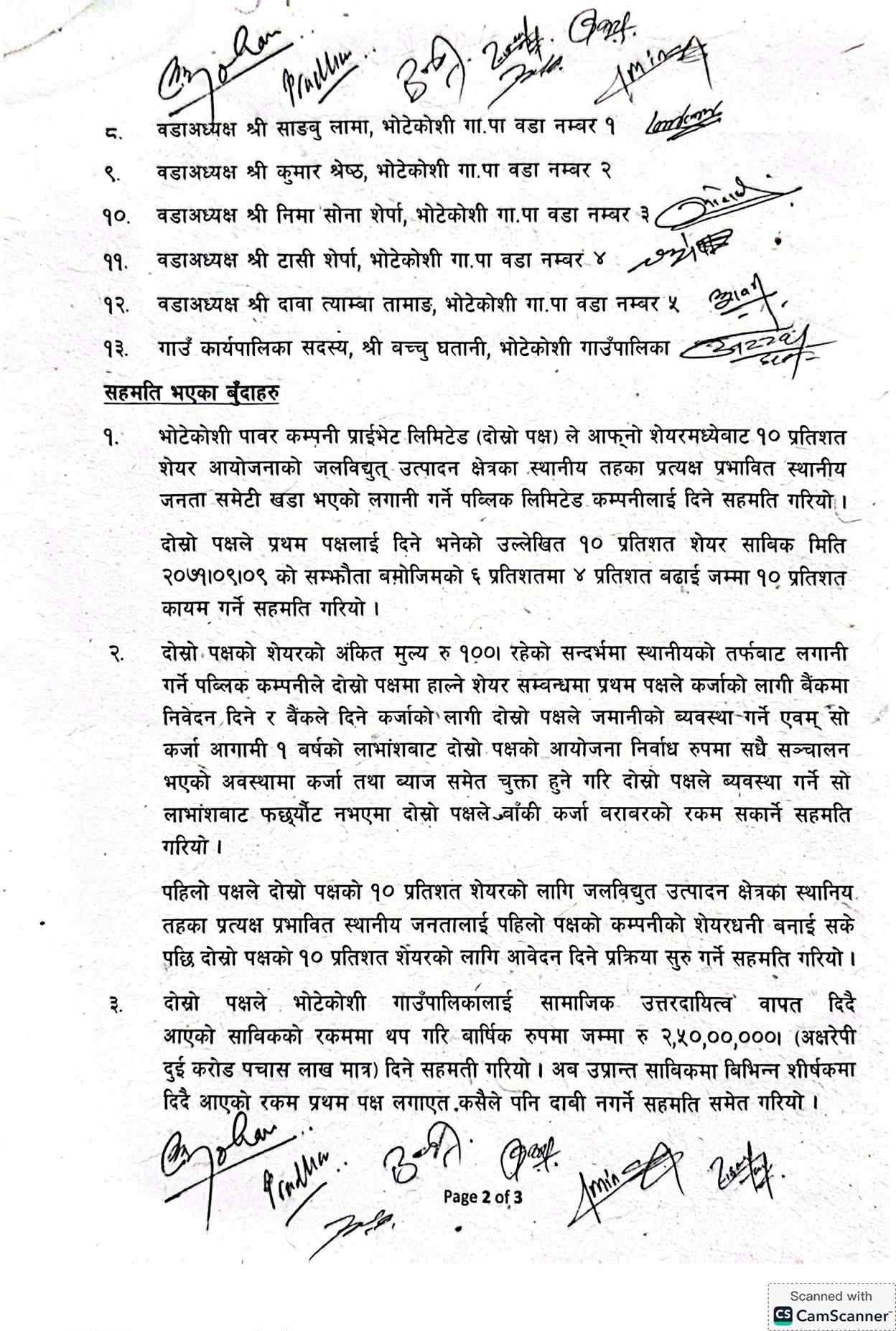भोटेकोशीले यसअघि २०७१ पुस ९ गते भएको सहमतिमा ६ प्रतिशत सेयरमा ४ प्रतिशत थपेर १० प्रतिशत दिन सहमति जनाएको छ । ‘भोटेकोशी पावर कम्पनी प्राईभेट लिमिटेडले आफ्नो सेयरमध्येबाट १० प्रतिशत शेयर आयोजनाको जलविद्युत् उत्पादन क्षेत्रका स्थानीय तहका प्रत्यक्ष प्रभावित स्थानीय जनता समेटी खडा भएको लगानी गर्ने पब्लिक लिमिटेड कम्पनीलाई दिने सहमति गरियो’ सम्झौता पत्रमा उल्लेख छ ।